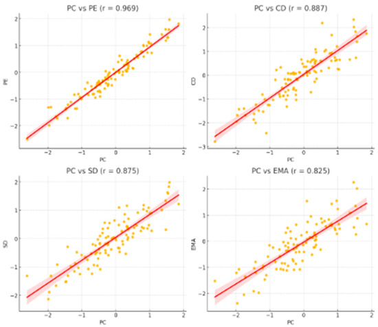 Table 4 presents the descriptive statistics and Pearson correlation coefficients among the five latent dimensions: PC, PE, CD, SD, and EMA. The mean scores range from 4.20 to 4.26, with standard deviations between 0.46 and 0.52, indicating relatively high and consistent responses across constructs. All correlation coefficients are statistically significant at the 0.01 level, denoted by **, suggesting strong positive linear relationships among the variables. Notably, the correlation between PC and PE is extremely high (r = 0.973), raising concerns that these constructs may not be empirically distinct. This suggests that policy incentives might better be treated as a second-order formative construct, or separated into government, industry, higher education, and NGO dimensions. Other notable correlations include PC–CD (r = 0.896), PE–CD (r = 0.898), and SD–EMA (r = 0.816). These findings indicate that the constructs are closely related, which supports convergent validity.