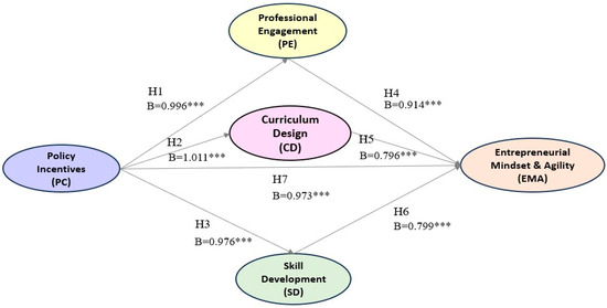 Figure 5 illustrates the structural model linking policy incentives, professional engagement, curriculum design, skill development, and entrepreneurial mindset and agility. Policy incentives function as the central driver, exerting both direct and indirect effects on entrepreneurial outcomes. The mediating pathways—professional engagement, curriculum design, and skill development—show how institutional support is translated into entrepreneurial mindset and agility. Collectively, the figure highlights that while policy provides the foundation, its impact depends on how effectively these pathways are activated and sustained.