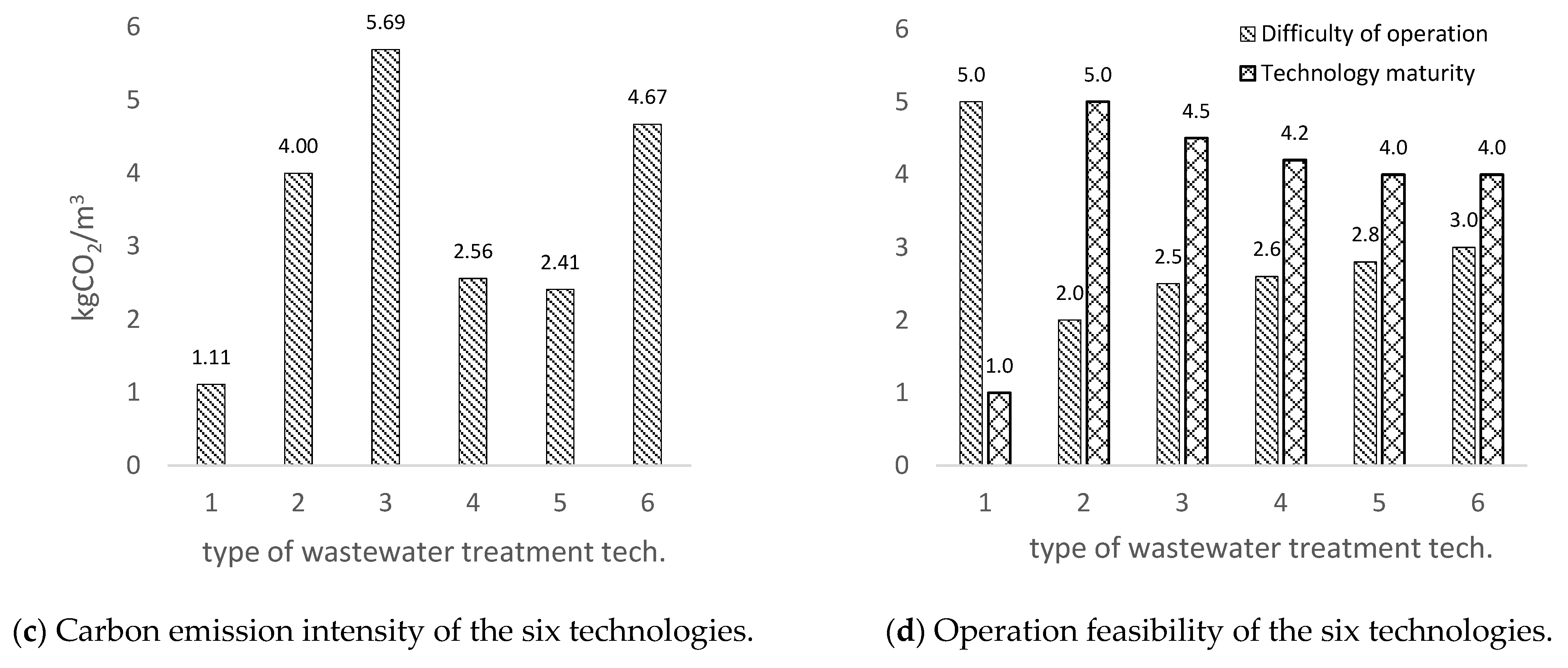 The six heavy metal wastewater treatment technologies also differ in terms of construction investment and operation costs, carbon emission intensity, and operational feasibility indicators (Figure 1). For example, Technology 3 has moderate construction investment and operating costs, but a relatively high carbon emission intensity due to the high electricity consumption. Technologies 4 and 5 have higher operating costs per ton of water, due to the addition of chemicals, but their energy consumption and carbon emission intensity are not high in actual operation. It should be noted that Technology 1 is awarded the highest score in terms of difficulty of operation and the lowest score for technology maturity because of its failure to meet the emission limits for Pb, Cd, and Tl.