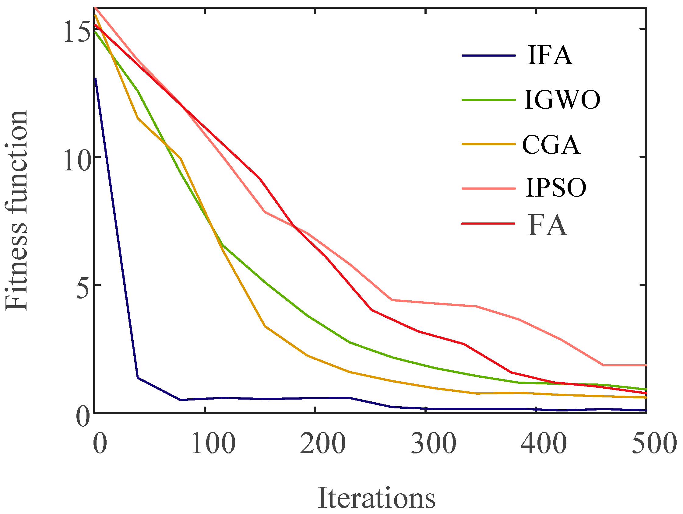 - By introducing Logistic mapping and an adaptive weight strategy, the proposed IFA shows significant advantages in convergence performance. Compared to the traditional FA algorithm, IFA achieves optimal values in fewer iterations, demonstrating higher optimization efficiency. Moreover, comparison experiments between IFA, IGWO, CGA, and IPSO show that the proposed IFA outperforms the other algorithms in global convergence and optimization ability, facilitating the development of higher-quality power distribution strategies.