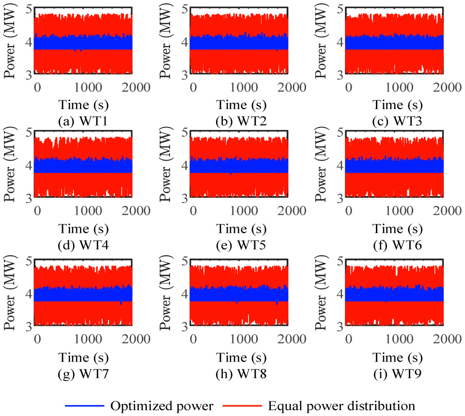 - Based on the fatigue load information for each turbine, the fitness value for all individuals is calculated, and the individual corresponding to the current best solution is selected. The algorithm then checks whether the convergence condition is met. If the algorithm has converged, the optimal power adjustment values for each turbine are output; otherwise, the iteration continues for further optimization.