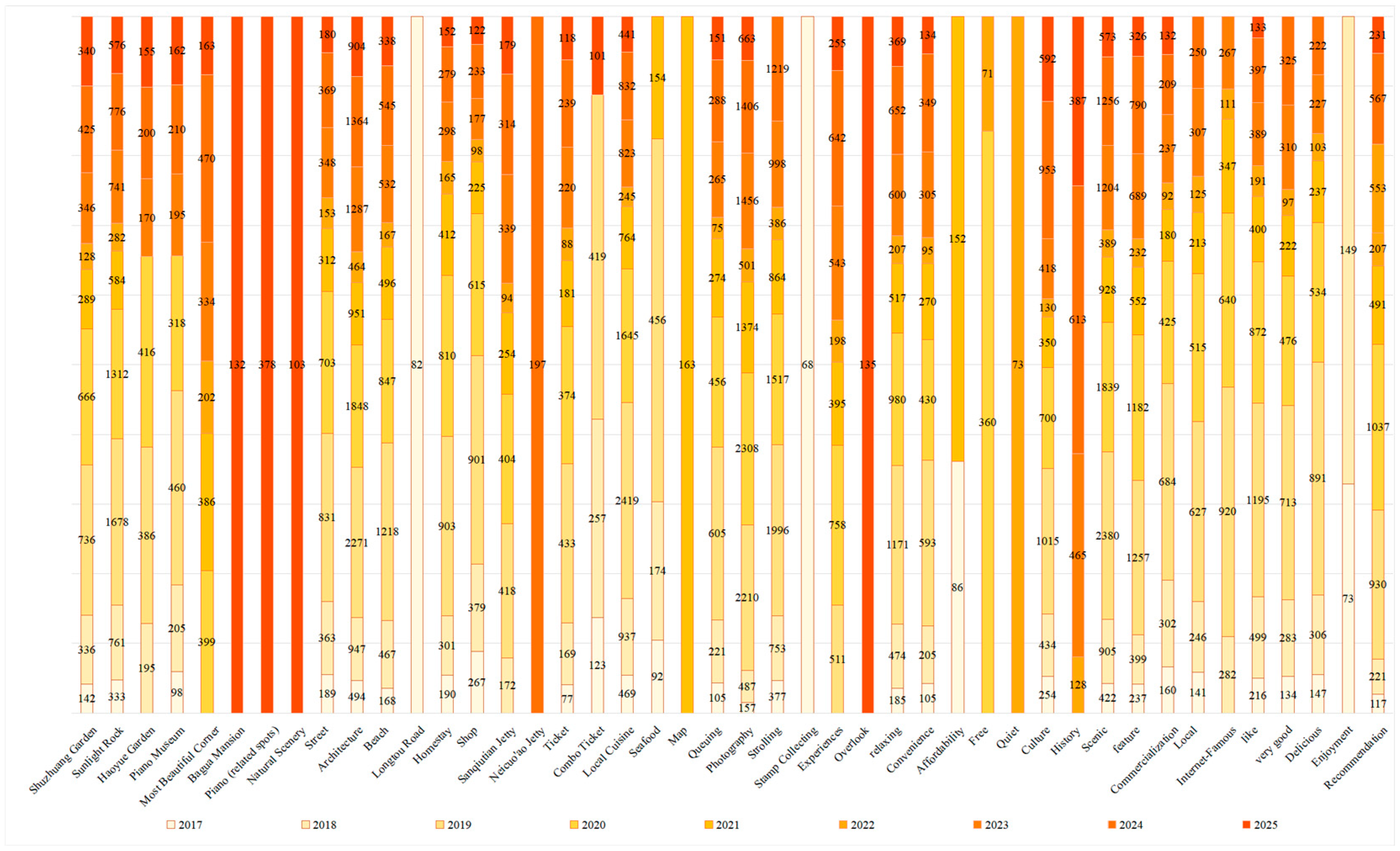 Chicago/Turabian StyleWei, Hanbin, Wanjia Zhang, Xiaolei Sang, Mengru Zhou, and Sunju Kang. 2025. "Disjunction Between Official Narrative and Digital Gaze: The Evolution of Sense of Place in Kulangsu World Heritage Site" Sustainability 17, no. 20: 9191. https://doi.org/10.3390/su17209191