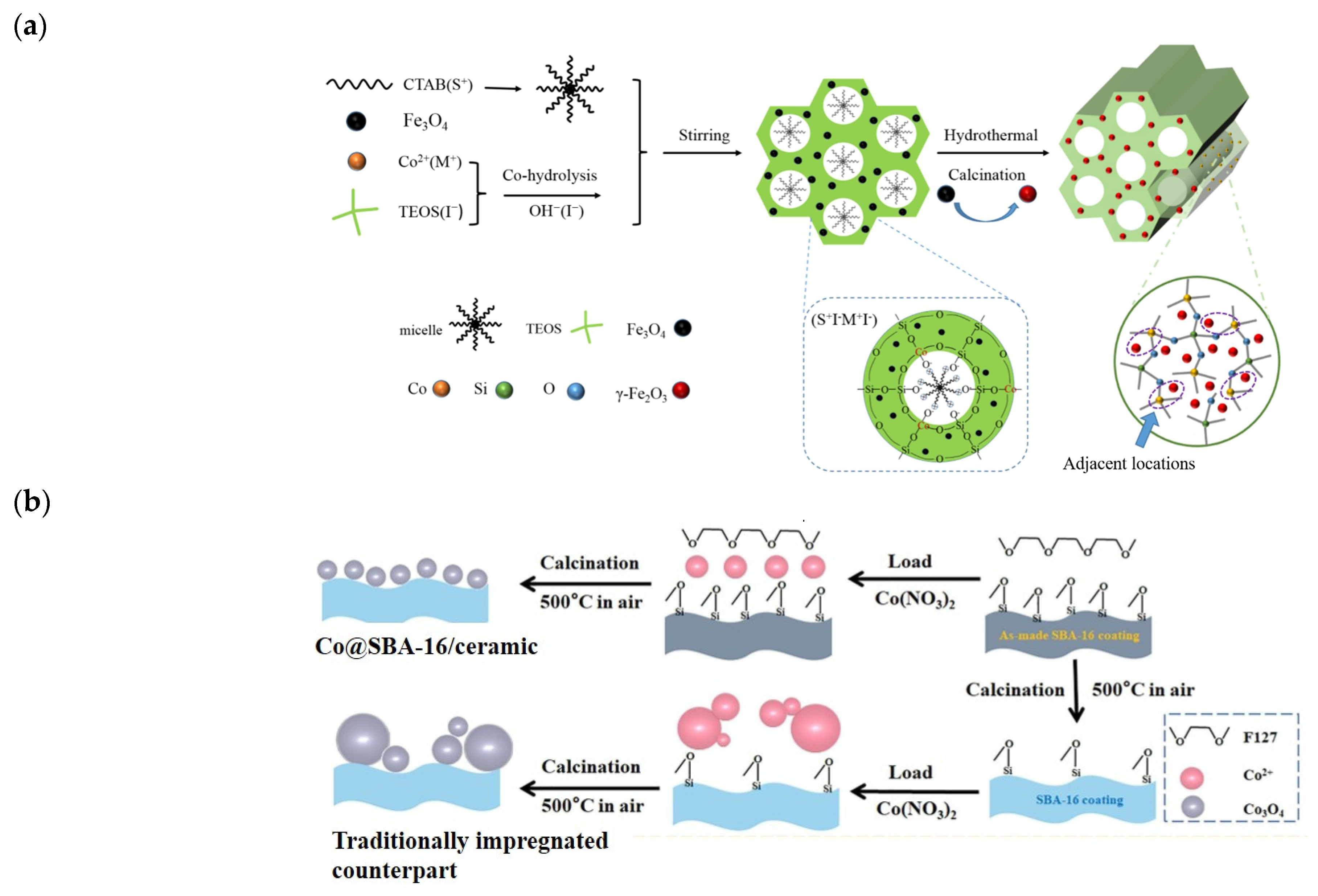 Co@SBA-16/ceramic | A P123-templated SBA-16/ceramic was impregnated with Co(NO3)2 solution, dried, and calcined. | d = 3.1 nm, S = 7.6 m2/g, Vtp = 0.007 cm3/g, Co = 0.9 wt% | [71] | |