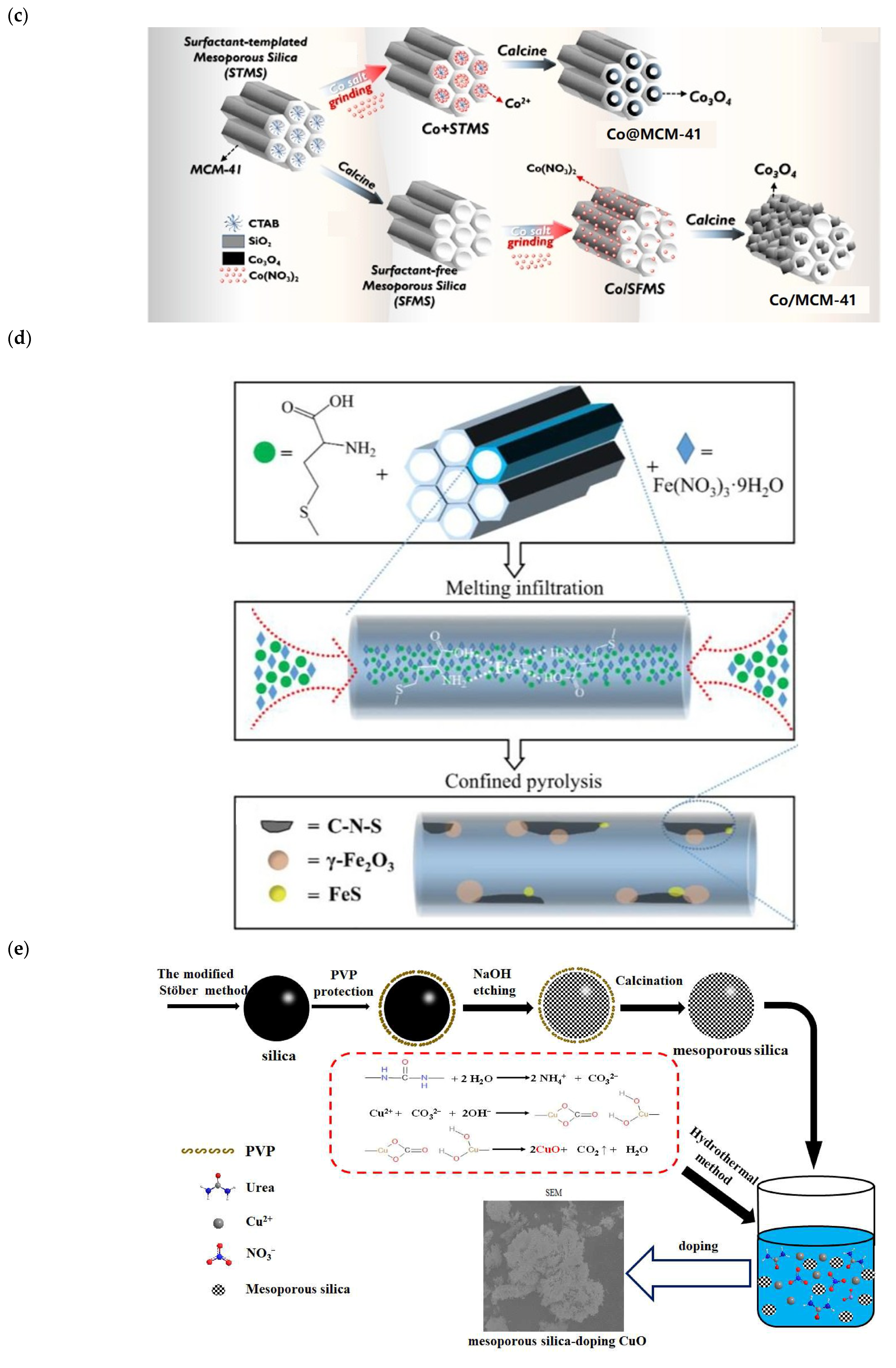 Mn-Co-MCM-41 | A thermosensitive polymer was dissolved in water; pH = 11 was adjusted with ammonia; ethyl orthosilicate, Mn(NO3)2 and Co(NO3)2 were added; and the solution was placed in a sealed high-pressure vessel, centrifuged and ground, and calcined under N2. | d = 2 nm, DH = 39.5 nm, PDI = 0.227 | [64] | |