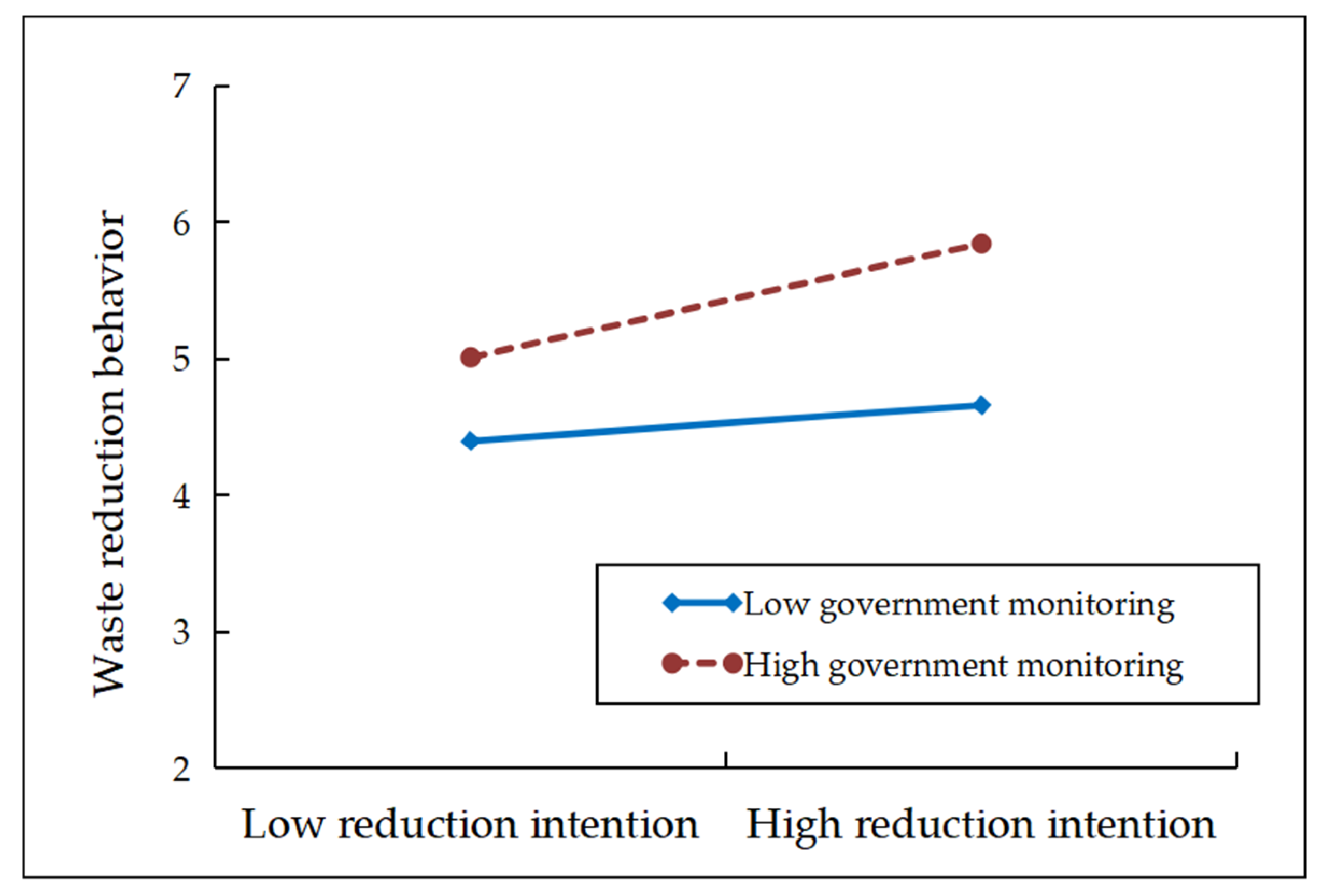 The institutional environment plays a crucial role in enabling the conversion of waste reduction intentions into actual CWR behavior, as demonstrated by the examination of the moderating influence of government monitoring. Under high levels of government monitoring, the promoting effect of reduction intention on behavior was significantly stronger than under low monitoring conditions, which contrasts with the finding of Wu et al. [