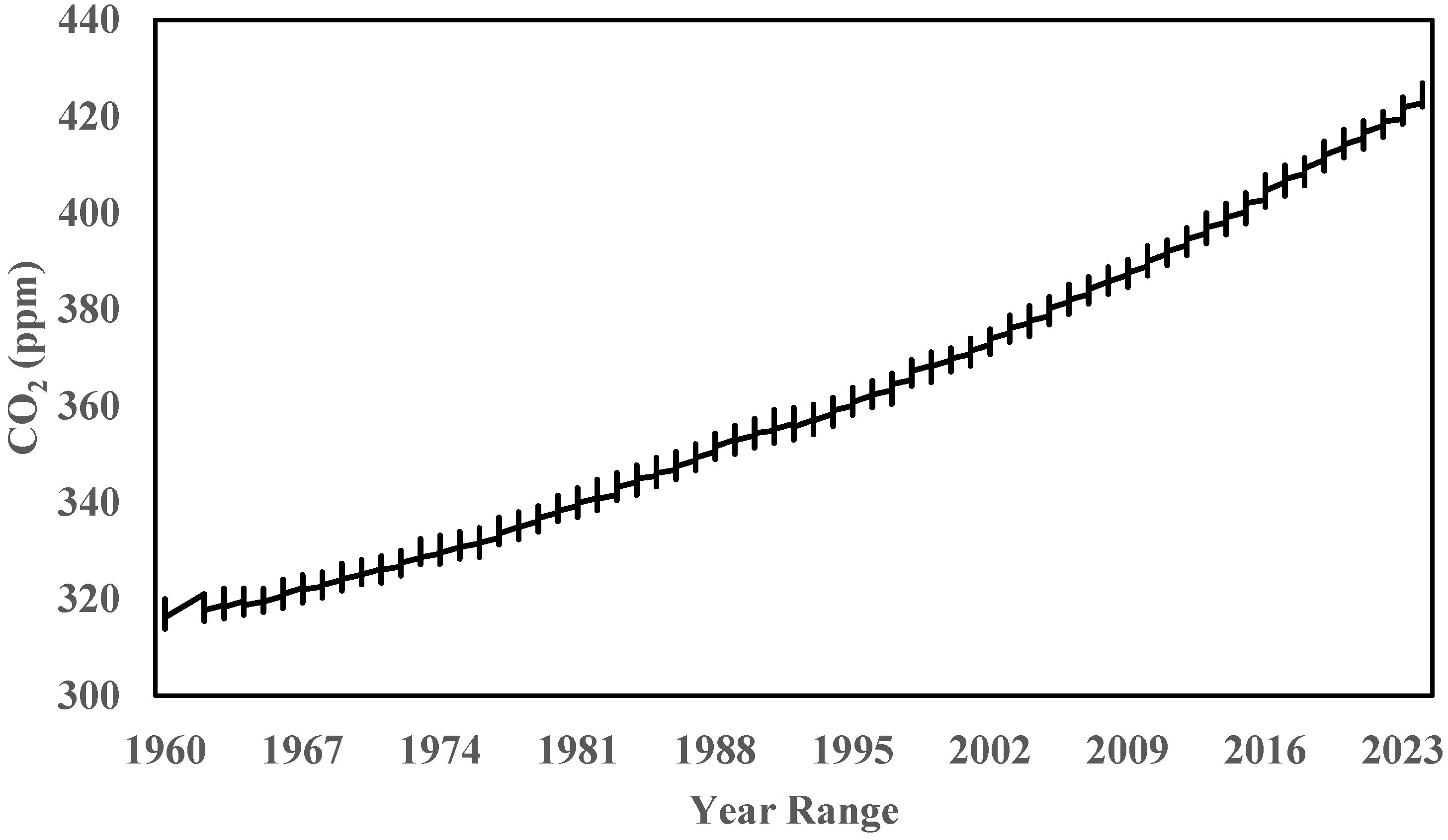 - NASA. Carbon Dioxide | Vital Signs—Climate Change—NASA. Available online: https://climate.nasa.gov/vital-signs/carbon-dioxide/?intent=121 (accessed on 23 September 2025).