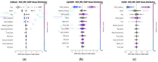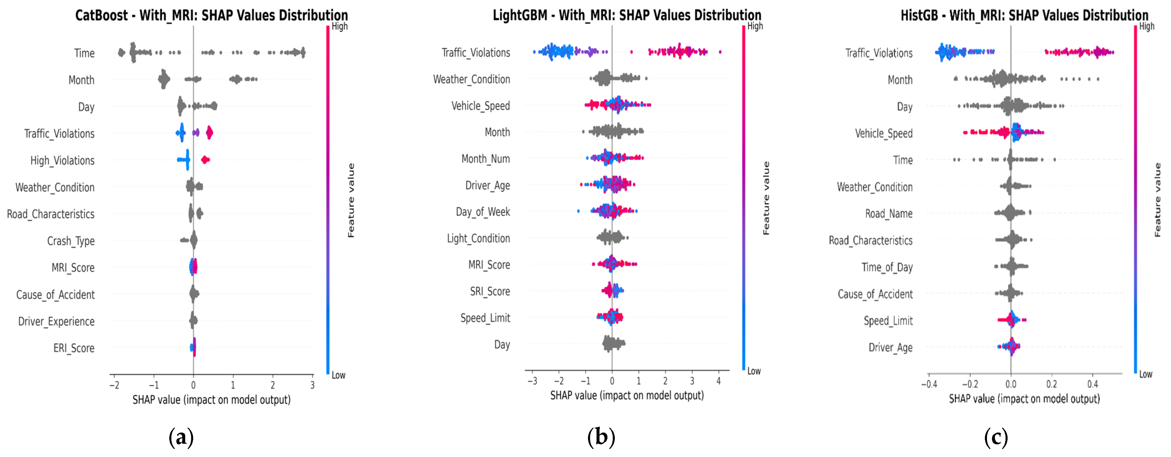 Figure 3a–c) reveal consistent patterns in feature importance across multiple gradient-boosting models (CatBoost, LightGBM, and HistGB), highlighting key drivers of crash severity. Across all models, temporal features; specifically, Time and Month, are among the most influential predictors, indicating that diurnal and seasonal cycles significantly modulate crash risk. This suggests that high-risk periods (e.g., rush hours or winter months) are critical windows for targeted interventions.