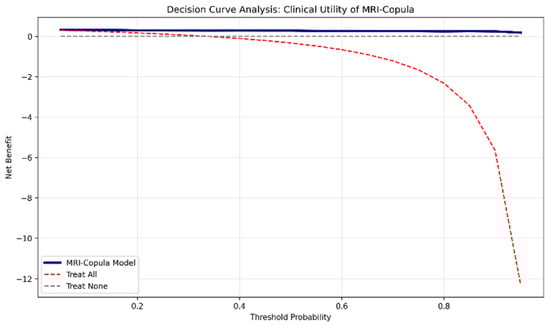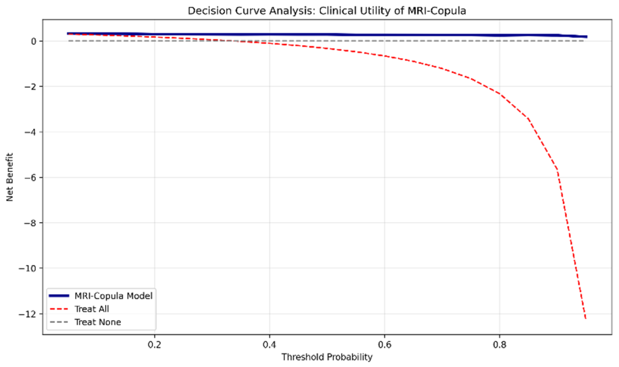 Decision Curve Analysis confirmed that MRI-Copula delivers greater net benefit across intervention thresholds than naïve “treat none” or “treat all” strategies [