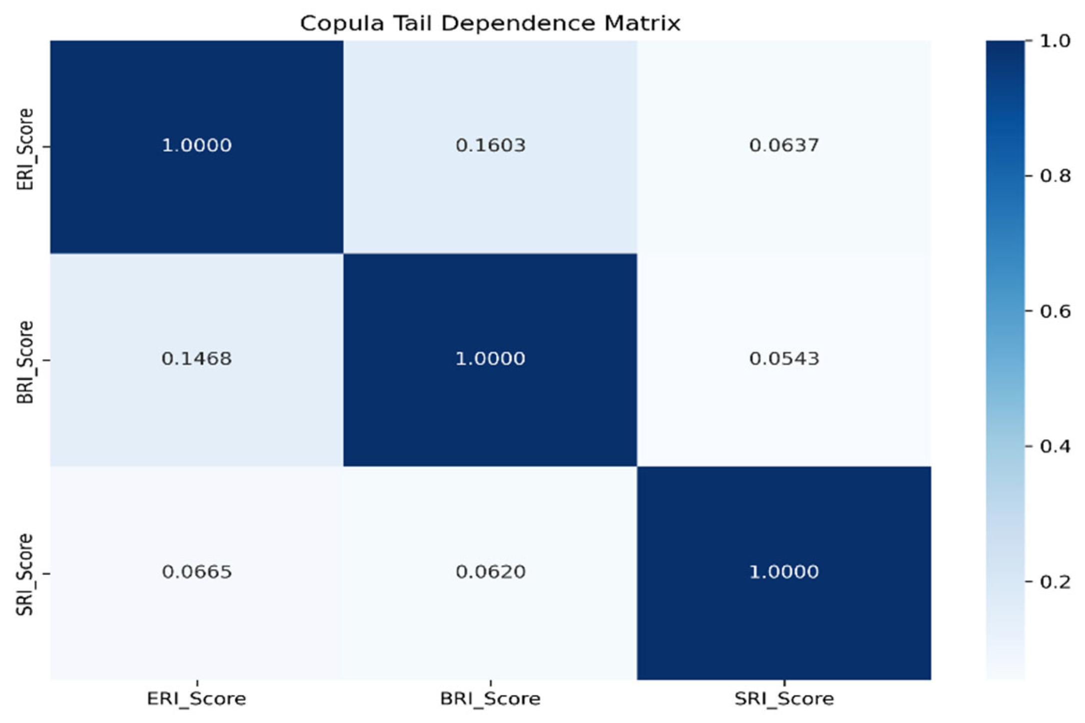 To further validate the structural independence of the sub-indices, a Variance Inflation Factor (VIF) analysis was conducted. The results (ERI = 1.01, BRI = 1.01, SRI = 1.00) indicate very low multicollinearity, confirming that each index captures a distinct risk dimension. This statistical independence reinforces the conceptual design of the MRI-Copula framework, ensuring that the integrated α-weighted index combines complementary—rather than redundant—sources of risk information.