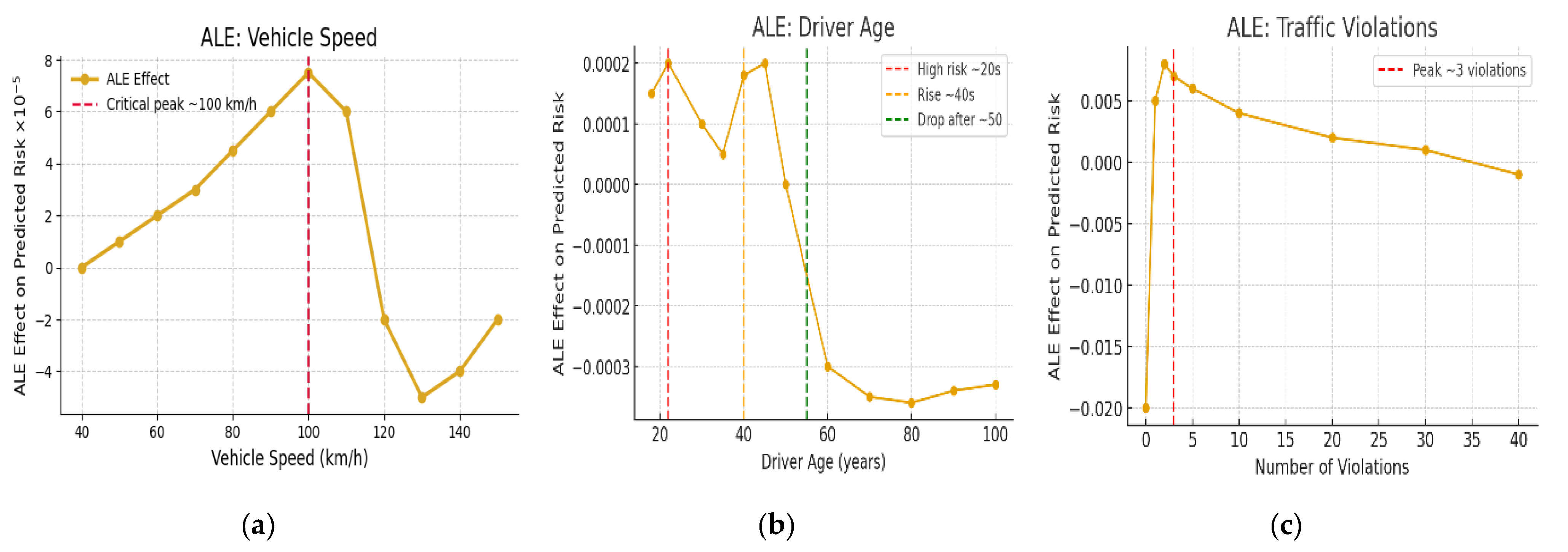 Additional insights came from the ALE analysis, which highlighted a sharp escalation in crash severity risk at around 100 km/h, followed by a decline at very high speeds. This suggests that the mid-to-high speed range represents the most critical zone for intervention, offering an empirical benchmark to guide urban speed-limit design and targeted enforcement [
