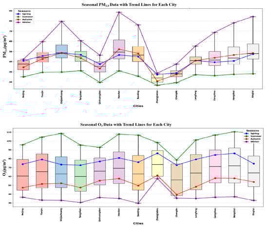 Figure 2 illustrates the descriptive statistics of hourly average PM2.5 and O3 concentrations in the Beijing–Tianjin–Hebei region from 2019 to 2023. PM2.5 concentrations exhibited a slight downward trend over the study period, accompanied by pronounced seasonal variations. Situated in the northern part of the North China Plain, the region experiences a typical warm temperate semi-humid and semi-arid continental monsoon climate, characterized by cold, dry winters and hot, rainy summers. As shown in Figure 2a, the annual mean PM2.5 concentration was highest in 2019 (49.39 μg/m3), gradually declining to 44.71 μg/m3 in 2020, 40.02 μg/m3 in 2021, and 37.4 μg/m3 in 2022, before a slight increase to 40.5 μg/m3 in 2023. Winters consistently recorded the highest mean PM2.5 concentrations across all years, particularly in 2019 (79.75 μg/m3), 2020 (79.79 μg/m3), and 2021 (52.42 μg/m3), driven by stable meteorological conditions, increased anthropogenic emissions, higher residential burning, lower temperatures, and reduced surface solar radiation [56]. In contrast, summer exhibited the lowest PM2.5 concentrations, with the minimum recorded in summer 2023 (20.69 μg/m3). Spring and autumn generally displayed moderate concentration levels.