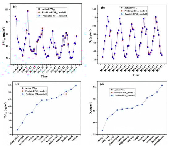 From the SHAP values of different influencing factors in Figure S9, Model I demonstrates that PM10 has the greatest impact on PM2.5 prediction and NO2 has the greatest impact on O3 prediction. For Model II, SO2 has the greatest impact on PM2.5 prediction and T has the greatest impact on O3 prediction.