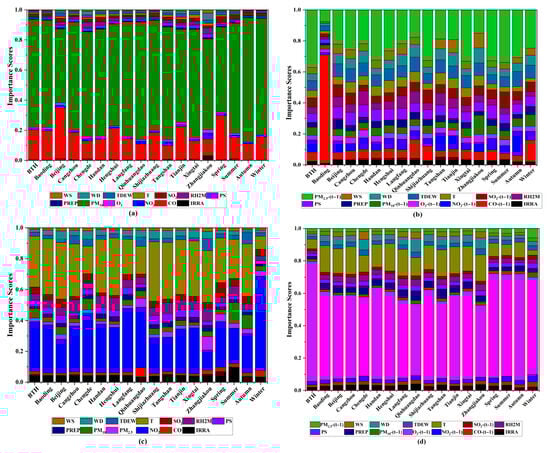 The importance scores of variables on pollutant prediction for different cities and seasons: (a) Model I for PM2.5 concentration; (b) Model II for PM2.5 concentration; (c) Model I for O3 concentration; (d) Model II for O3 concentration.