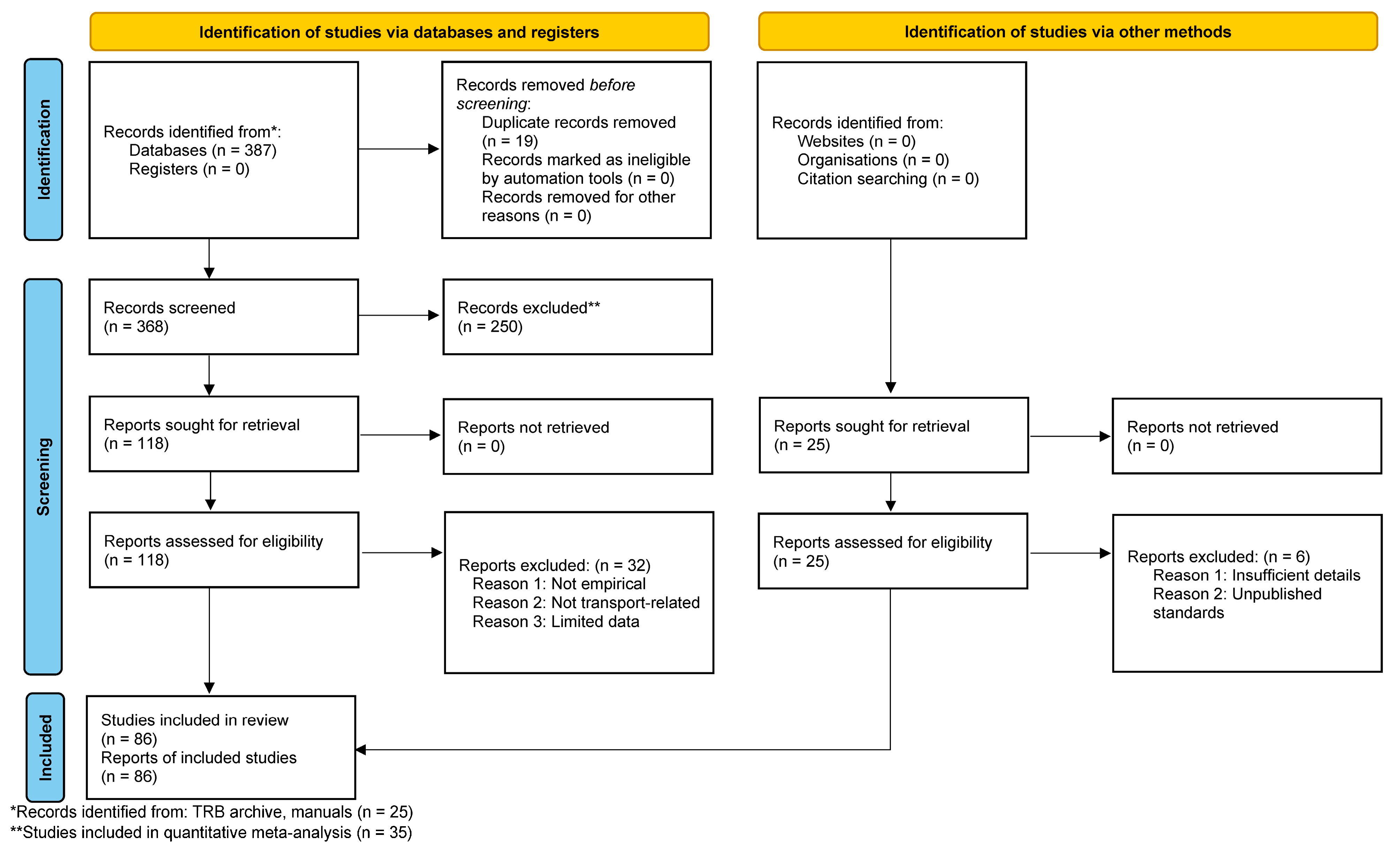 Despite the absence of formal bias assessment tools, several strategies have been employed to mitigate the potential sources of bias. Comprehensive searches were conducted across multiple databases, including Scopus, Web of Science, ScienceDirect, Google Scholar, and the TRB e-newsletter archive, to reduce the likelihood of selective reporting and publication bias. The gray literature such as government manuals and technical reports were also included to ensure broader coverage [