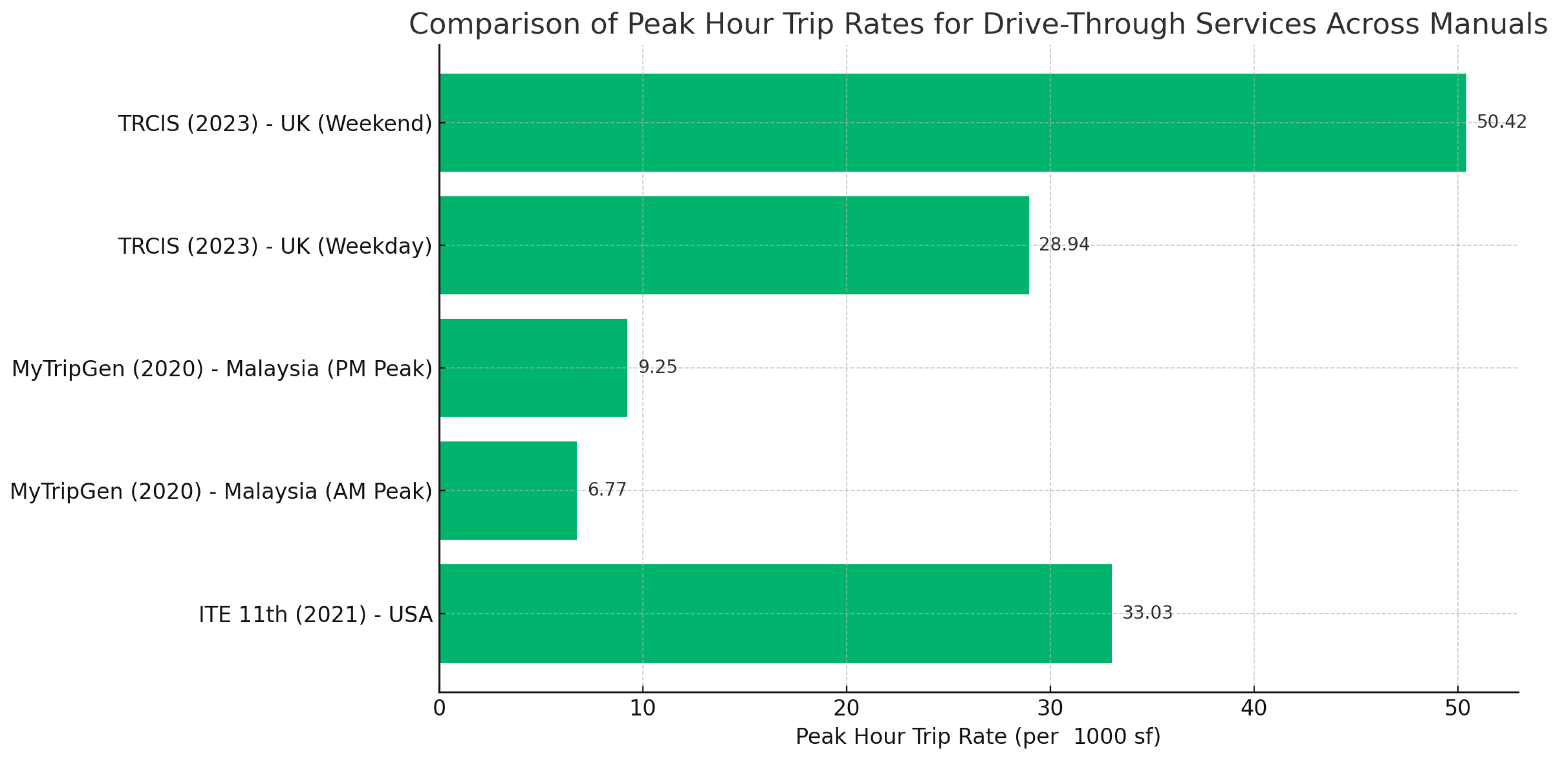 Figure 5 compares peak-hour trip generation rates for drive-through services across three major trip generation manuals: the UK’s TRICS [