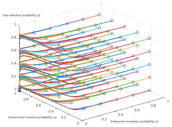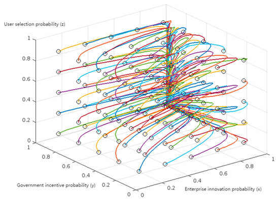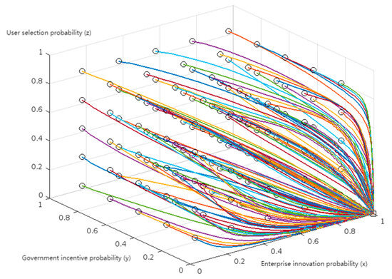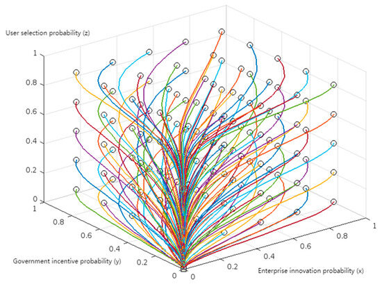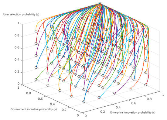 At this time, . E8 (1, 1, 1) is the evolutionary stable equilibrium point, and the evolutionary stable strategy is (Active Innovation, Strong Incentive, Choosing Innovative Products). This is an ideal state under tripartite collaboration, and its simulation result is shown in Figure 5.