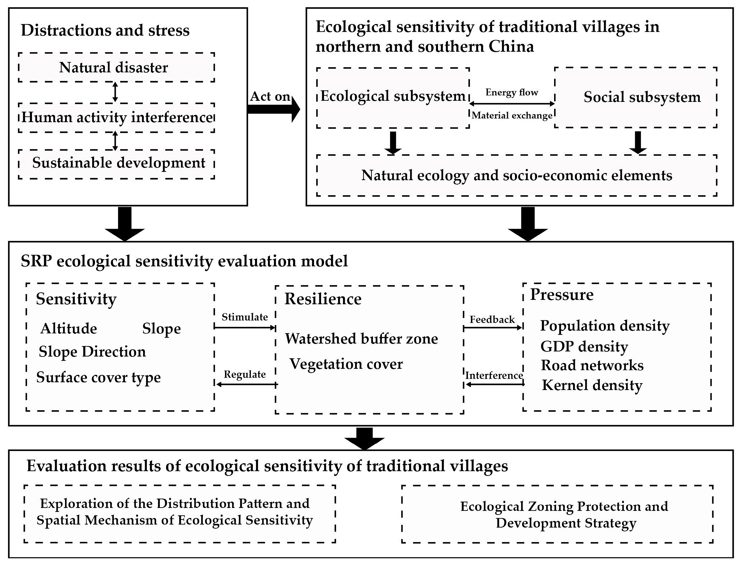20]. The SRP model defines ecosystem stability based on three dimensions: ecological sensitivity, resilience, and environmental pressure. This structure effectively integrates diverse assessment factors. Therefore, we adopted the SRP framework and constructed a village-specific ecological sensitivity assessment model. The following key indicators were incorporated: elevation, water proximity, vegetation coverage, land cover type, population density, and road density.