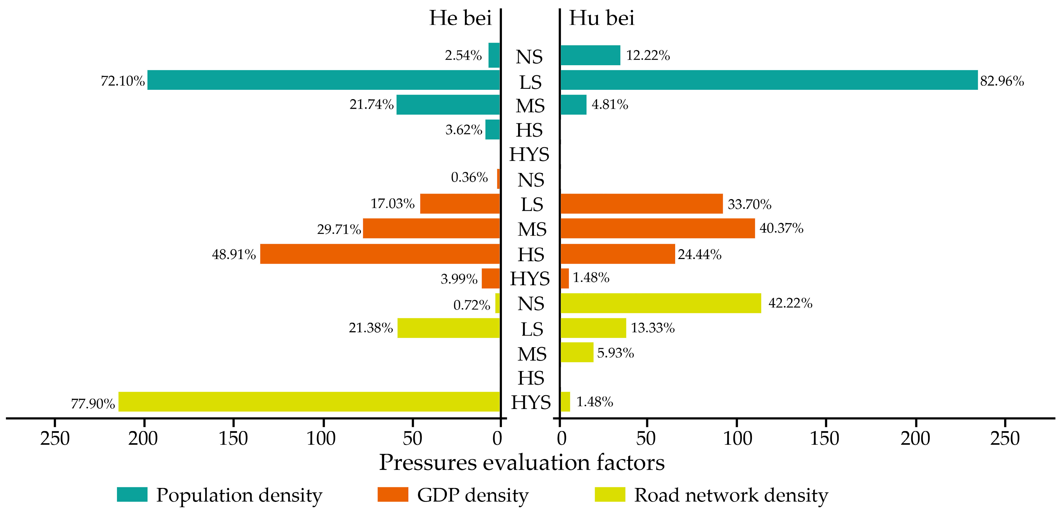 In Hebei Province, the high ecological sensitivity, particularly in the southern High-High clusters such as Xingtai (46.36% of highly sensitive villages) and Handan (30%), is strongly associated with intense anthropogenic pressure. This is evidenced by the province’s high average road network density (2.9 km/km