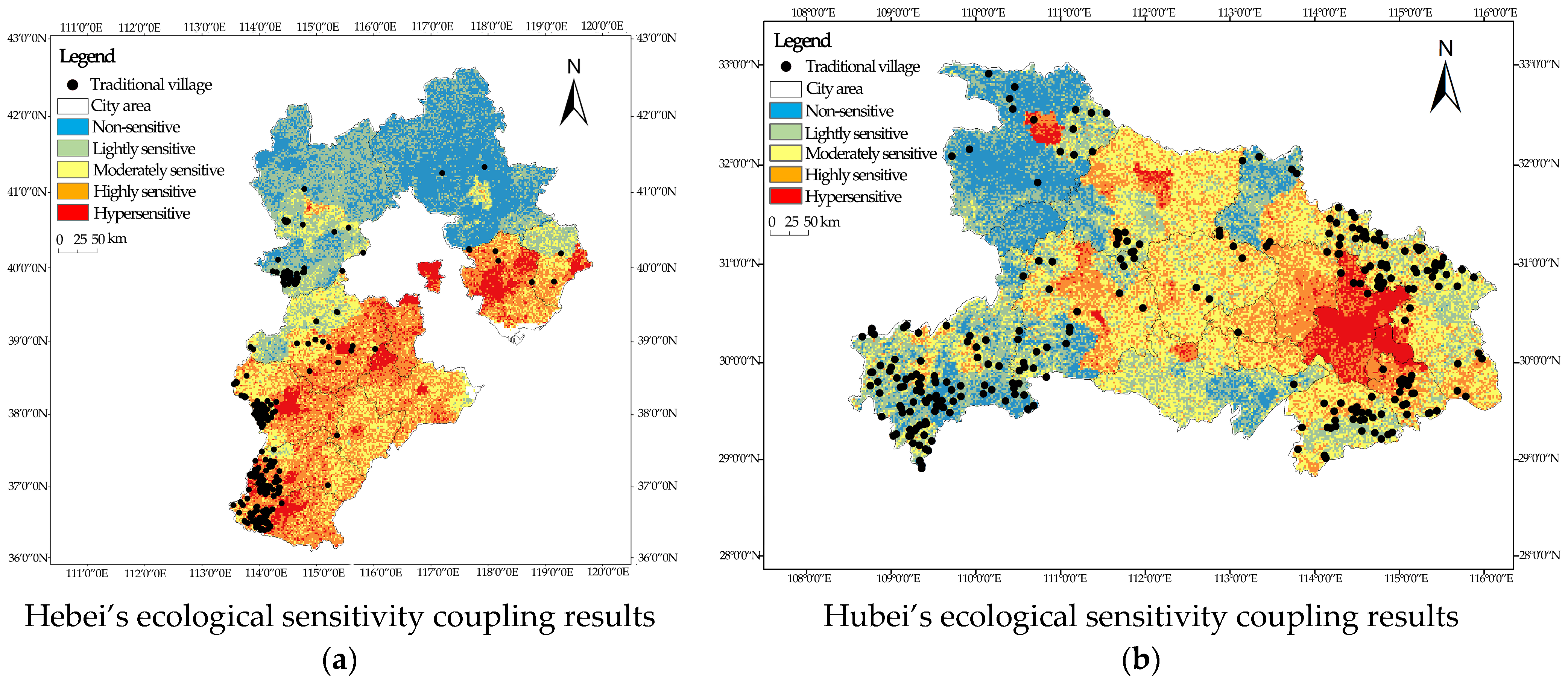 Optimal traditional village conservation occurs in sunny, low-altitude flatlands with mountain-forest and river-adjacent buffers. Hubei villages are clustered on gentle slopes near water, showing higher natural ecological sensitivity than Hebei villages. Human-land interaction underpins urban–rural sustainability. Urbanisation drives sociotechnological progress; however, it also disrupts villages and compromises their integrity. Thus, socioeconomic factors outweigh natural factors in sensitivity weighting [