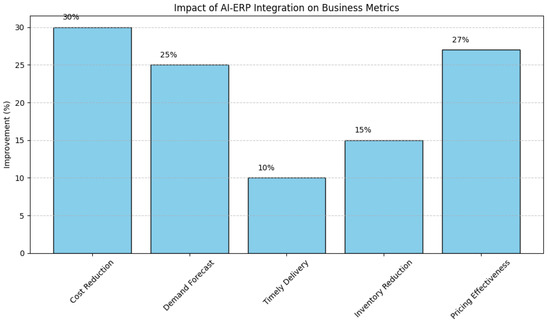 Business Benefits from AI-ERP Integration. Percentage improvements in key operational metrics due to AI-ERP integration across global SMEs. Data derived from secondary literature and case reports [12,14,15].