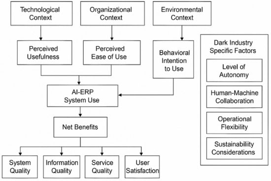 The incorporation of AI in Medicare, the green economy and different industrial sectors has emerged during the last few decades. For Instance, AI applications, including CNN-Transformer based models (e.g., BERT version 1.0), XGBoost (version 2.1.0) framework, Explainable AI, Neural Networks, have been successfully applied in bridging the gaps between traditional finance and Blockchain ecosystems, medicare fraud detection, customer interaction models and enhancing digital payment security [34,35,51,52]. Therefore, this study presents a potentially improved theoretical framework for integrating AI into the ERP system, oriented explicitly towards industrial automation in a new environment known as the dark industry [16]. The suggested framework leverages the synergy of three existing models: TOE, TAM, and the IS Success Model, and integrates industry-specific factors, including autonomy, human–machine collaboration, flexibility, and sustainability [19]. The framework can present an entire plan for deploying AI-ERP in highly profitable, highly automated settings, using pre-adoption readiness, user acceptance, and post-adoption performance as its key metrics.