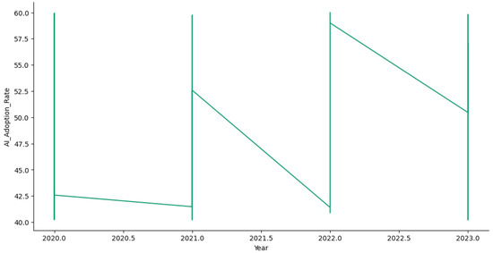 Figure 4 depicts the AI adoption rate from 2020 to 2023. The AI adoption rate started at a high level in 2020, reflecting early enthusiasm and investment in AI-driven solutions. There was a noticeable decline in the adoption rate between 2020 and 2023, with significant fluctuations observed in 2021 and 2022. This suggests that while initial interest was strong, ongoing challenges such as implementation complexities, data quality issues, and workforce readiness may have impacted sustained adoption. By 2023, the adoption rate has stabilised at a slightly lower level compared to 2020, indicating that organisations are adapting to these challenges but have not yet regained the initial momentum.