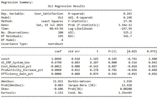 In highly automated industrial procedures, such as those in dark factories, regression analysis attempts to identify factors that influence user satisfaction with AI-ERP systems [19]. The highest impact on the successful implementation of AI-ERP has been user satisfaction, as the adoption process of an AI-ERP system is closely tied to the level of user satisfaction [16]. This study used the Ordinary Least Squares (OLS) regression model to analyse the influence of user satisfaction on other important variables such as AI_ERP_System_Use, Cost_Reduction_pct, Productivity_Increase_pct and efficiency_Gain_pct. The selection of these variables is connected to the fact that they are relevant in terms of the TOE, TAM, and the IS Success Models, which revolve around the aspects of technological readiness, user acceptance, and success beyond adoption [26].