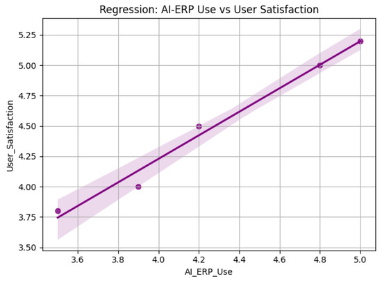 Figure 7 shows the positive linear relationship between AI-ERP system usage and user satisfaction based on firm-level regression analysis (n = 200). This figure includes charts likely showing trends over time for these metrics and potentially breakdowns of investments or returns by category, offering a concise overview of the financial performance. Each purple dot represents a single firm’s observed values. The solid purple line is the fitted regression line, indicating that higher AI-ERP adoption is associated with greater user satisfaction. The light purple shaded region represents the 95% confidence interval around the regression line, reflecting statistical precision.
