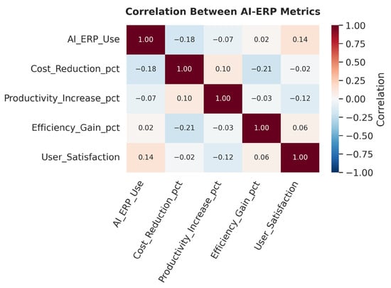 Correlation Between AI-ERP Metrics. Correlation matrix showing interrelationships between AI-ERP system usage, productivity, cost reduction, efficiency, and user satisfaction.