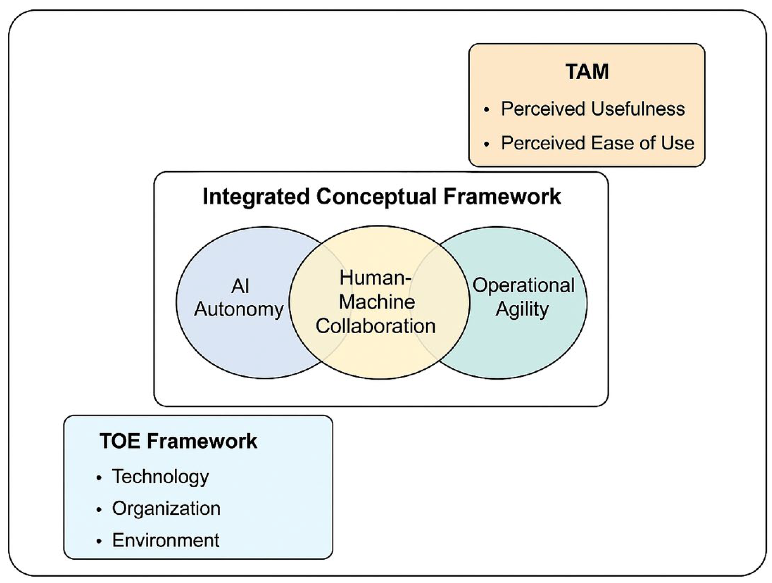 TOE | Internal organisation and external factors influencing adoption, including technology characteristics, firm size, and environmental pressures | Captures broader organisational and environmental potentials and barriers, ensuring alignment with market competitiveness and regulatory requirements | Technological readiness, AI infrastructure, organisational structure, and external pressures (e.g., industry competition) | Does not consider user perspectives or system performance metrics | Integrating TOE with TAM and IS Success bridges this gap by incorporating individual-level insights and post-adoption performance evaluations, offering a complete view from infrastructure readiness to user satisfaction and system impact. |