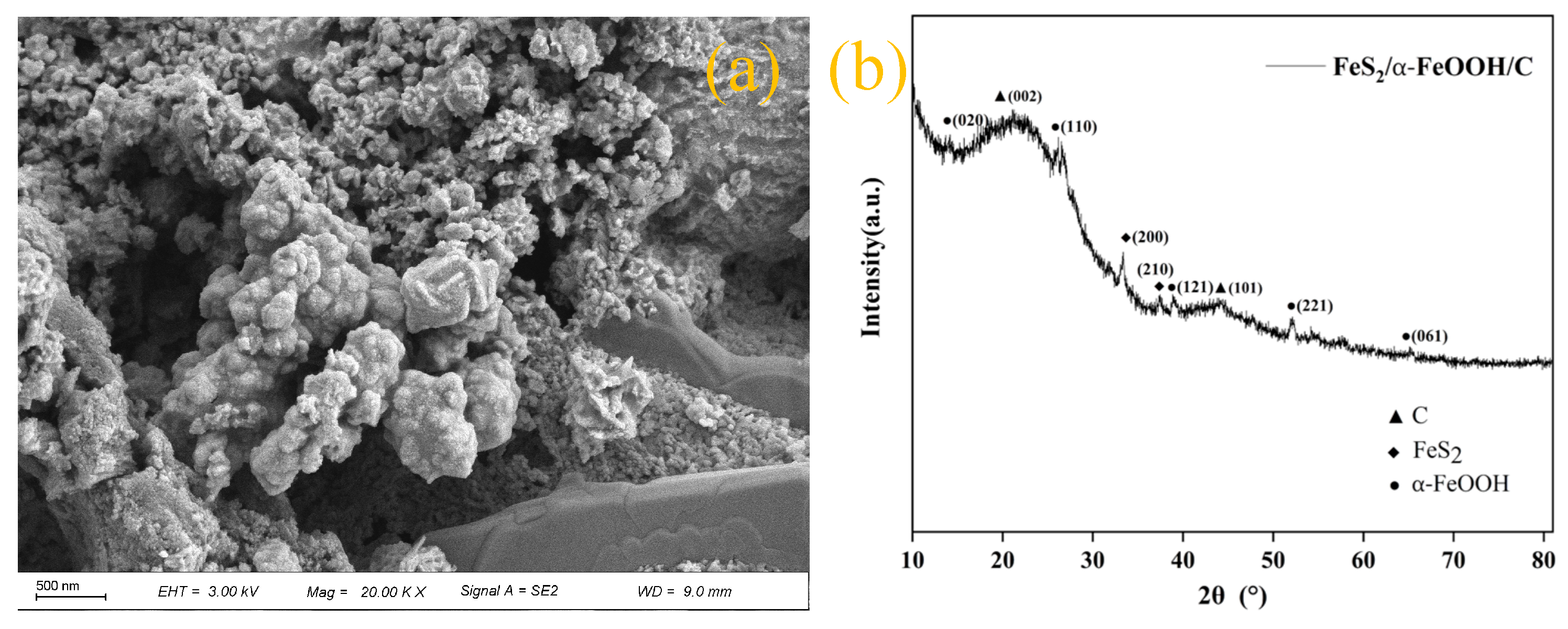 2.1. Fabrication of FeS2/α-FeOOH/C Composite and Reagents