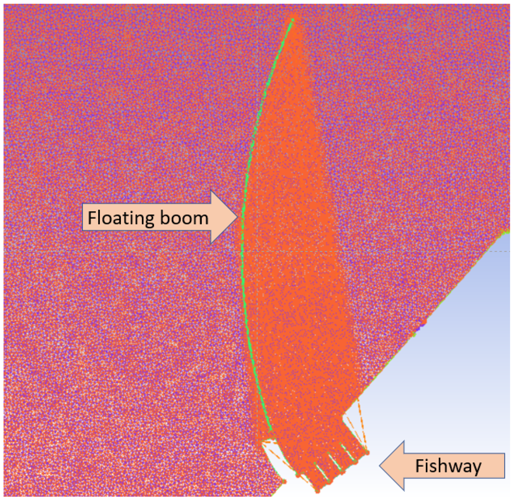 In the CFD model, the volumes were discretized using tetrahedral elements. Local grid refinement was applied to the region around the entrance to the fish and around the floating boom (see
