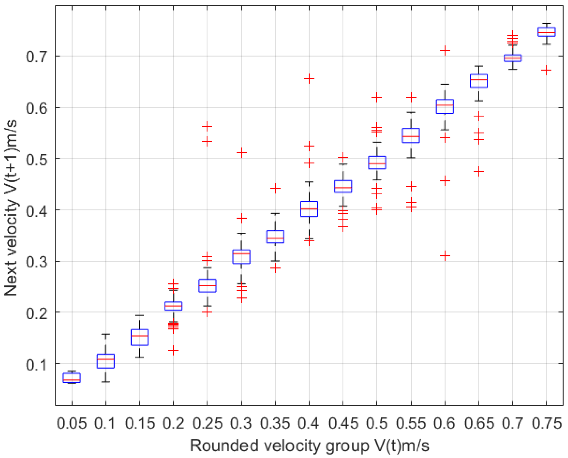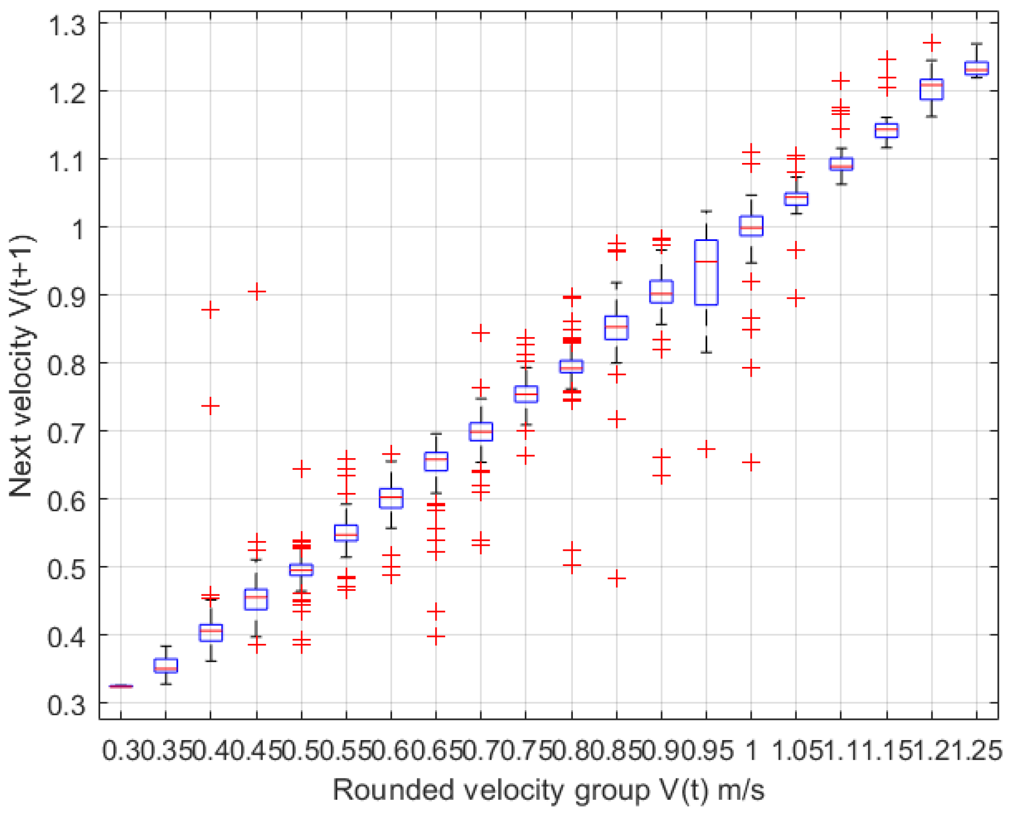 Figure 13 displays the distribution of all the transitions to the next time step. In some velocity groups, particularly within the range of