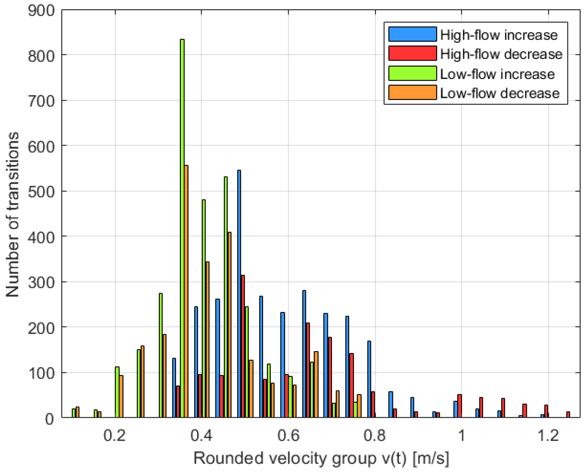 By examining both the low-flow and high-flow scenarios together, it was possible to identify certain differences in the smolt behavior. Under low-flow conditions, many transitions occurred at velocities around