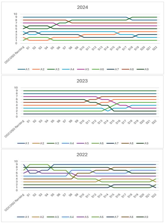According to the comparative results obtained from 22 scenarios over three years, the rankings in 2022 exhibited greater fluctuations than those in 2023 and 2024. In 2023, three companies (A9, A1, and A7) consistently maintained the same rankings across all scenarios, while the remaining companies continued to show noticeable variations in their positions. By 2024, ranking fluctuations had become relatively minor; most companies shifted only one position up or down, except for A3, which deviated from this general pattern. These findings indicate that the CoCoSo method has become more robust over time, yielding increasingly stable and reliable ranking outcomes.