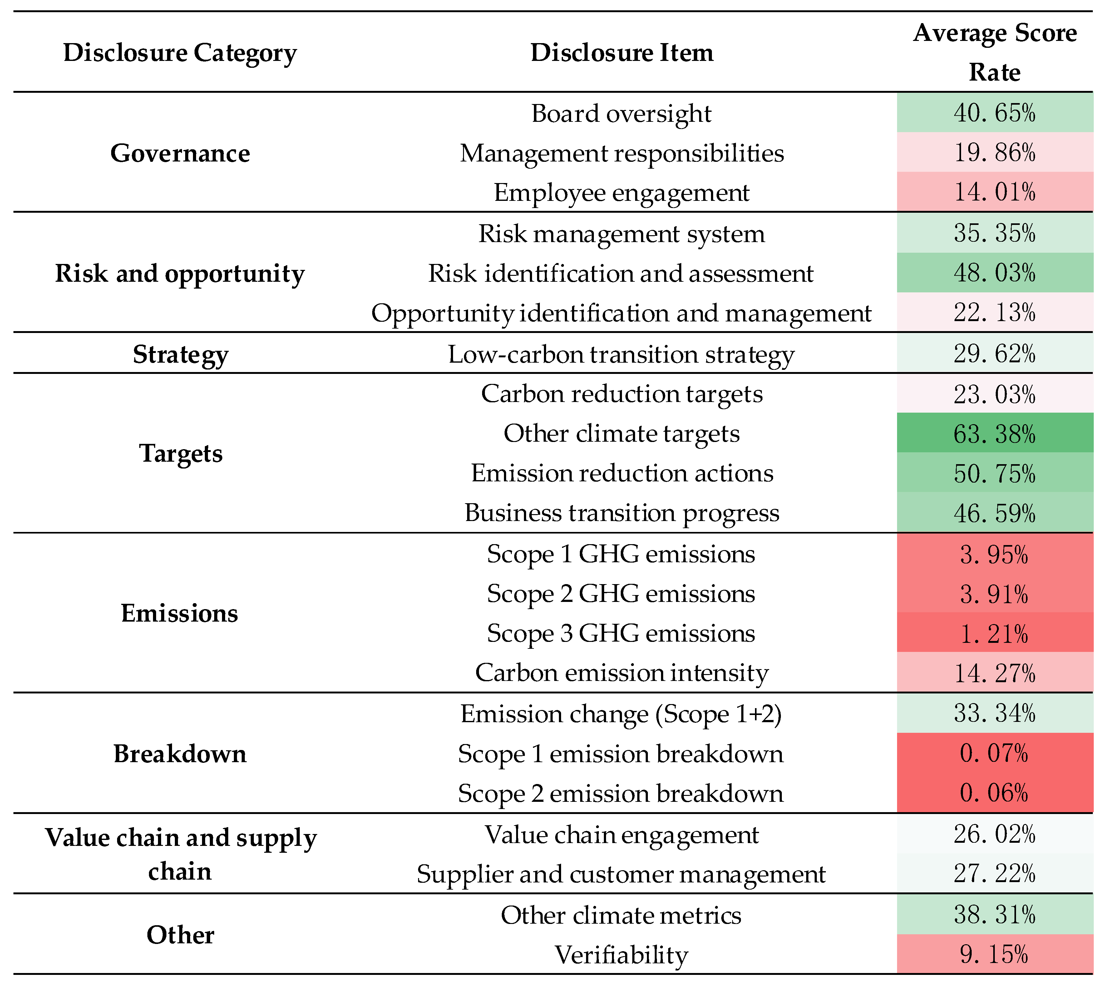 Additionally, this paper uses sample data to generate a heat map illustrating the average disclosure rate for each disclosure item, as shown in Figure 2. The color green indicates better disclosure, while red signifies poorer disclosure. Overall, companies have performed reasonably well in qualitative management items, but there is a significant lack of disclosure regarding quantitative emissions data. Specifically, within the “Targets” category, “Other climate targets” (63.38%), “Emission reduction actions” (50.75%), and “Business transition progress” (46.59%) achieved relatively high scores, indicating preliminary implementation in strategic planning and emissions reduction actions. Additionally, “Board oversight” (40.65%) and “Risk identification and assessment” (48.03%) also indicate that companies have established a certain foundation in disclosing these aspects. However, in stark contrast, quantitative disclosures involving specific emissions and breakdowns remain extremely low. The average disclosure rate for “Scope 1 and 2 GHG emissions” is merely 3.93%, “Scope 3 GHG emissions” at 1.21%, and “Scope 1 and 2 emission breakdown” at a mere 0.06%. These extremely low scores for critical quantitative indicators not only do not diminish their value but, by accurately reflecting current disclosure weaknesses, become even more representative. The variation in scores across items closely aligns with the actual difficulty of disclosure, demonstrating that this indicator system reliably measures companies’ actual performance in carbon information disclosure.