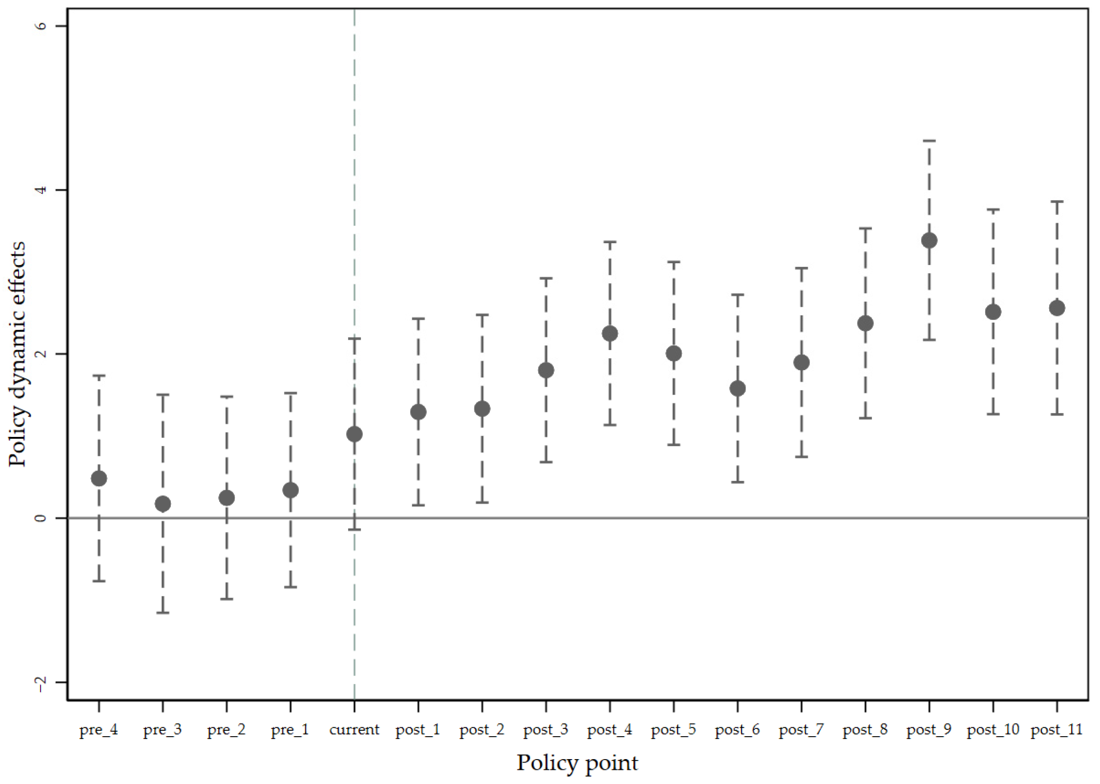This study conducted an annual dynamic effect analysis to test the parallel trend assumption. Using 2012 as the base year, we constructed a time (Time) dummy variable and multiplied it by the treatment variable (Treat), subsequently conducting regression analysis with model (1). The test results are presented in Figure 3, with the vertical axis showing the DID regression coefficients. The results of the regression analysis indicate that prior to the implementation of the policy, the regression coefficients fell within the 95% confidence interval and were not significantly different from zero. This finding suggests that there were no marked differences in carbon information disclosure levels between the experimental group and the control group before the policy was enacted. After the policy’s implementation, the regression coefficients showed significant positive values, indicating that the policy positively impacted firms’ carbon information disclosure behavior. This outcome supports the earlier-mentioned parallel trend assumption.