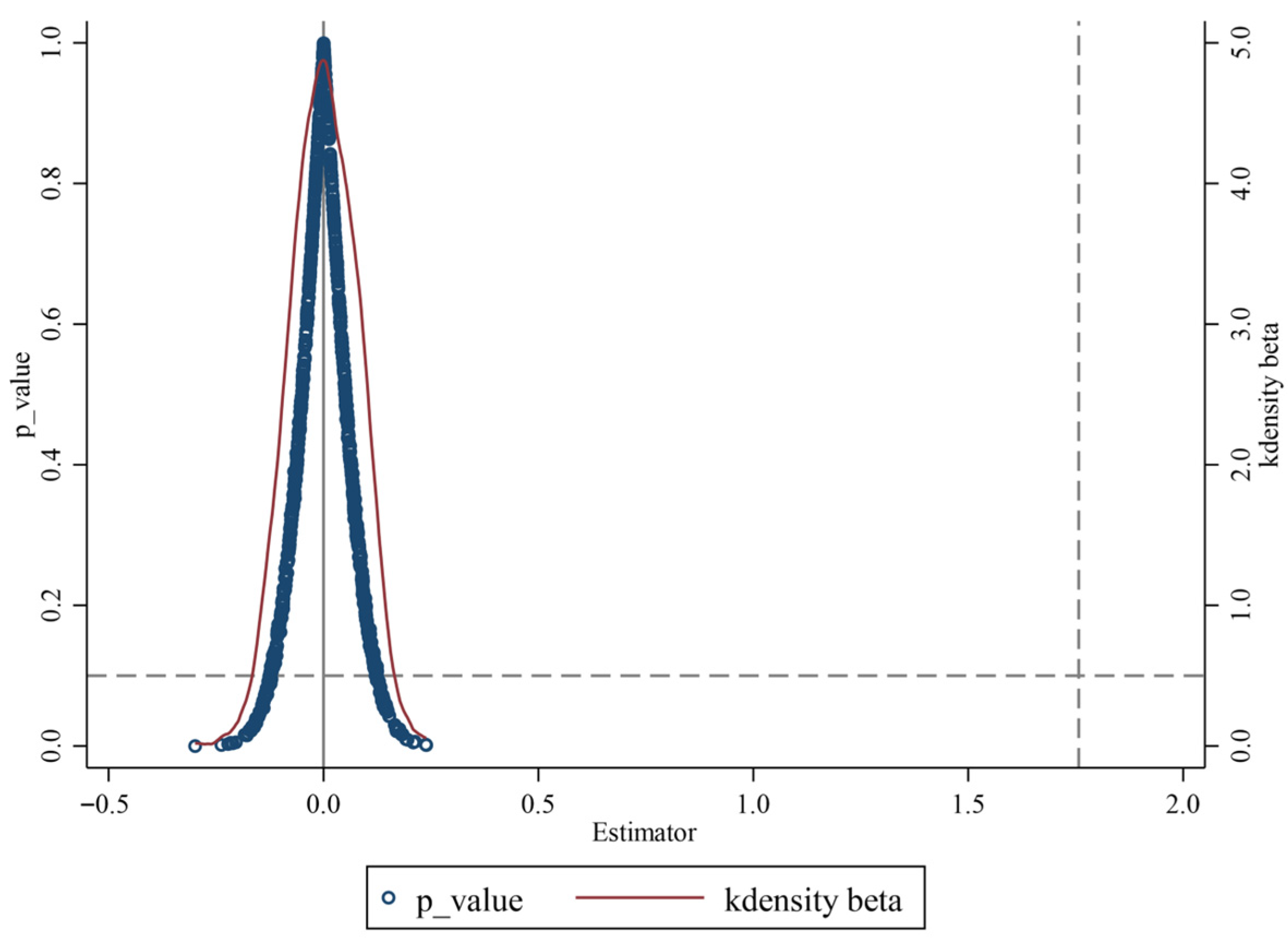 The benchmark regression findings indicate that green credit policies substantially enhance corporate carbon information disclosure. However, these results may be affected by random factors. To account for this, this study employs the method of randomly shuffling the independent variables and conducting 1000 random shuffles and reallocations to create a virtual policy effect. Figure 4 presents the distribution of the estimated coefficients of the virtual policy effect after these 1000 random operations. The findings reveal that the estimated coefficients of the virtual policy effect follow a normal distribution, with most coefficients concentrated around zero. It shows a significant difference from the projected value of the actual policy effect, which is 1.757. This finding suggests that random factors do not drive the results of the benchmark regression but are statistically robust, further supporting the significant effect of green credit policies on the enhancement of corporate carbon information disclosure.
