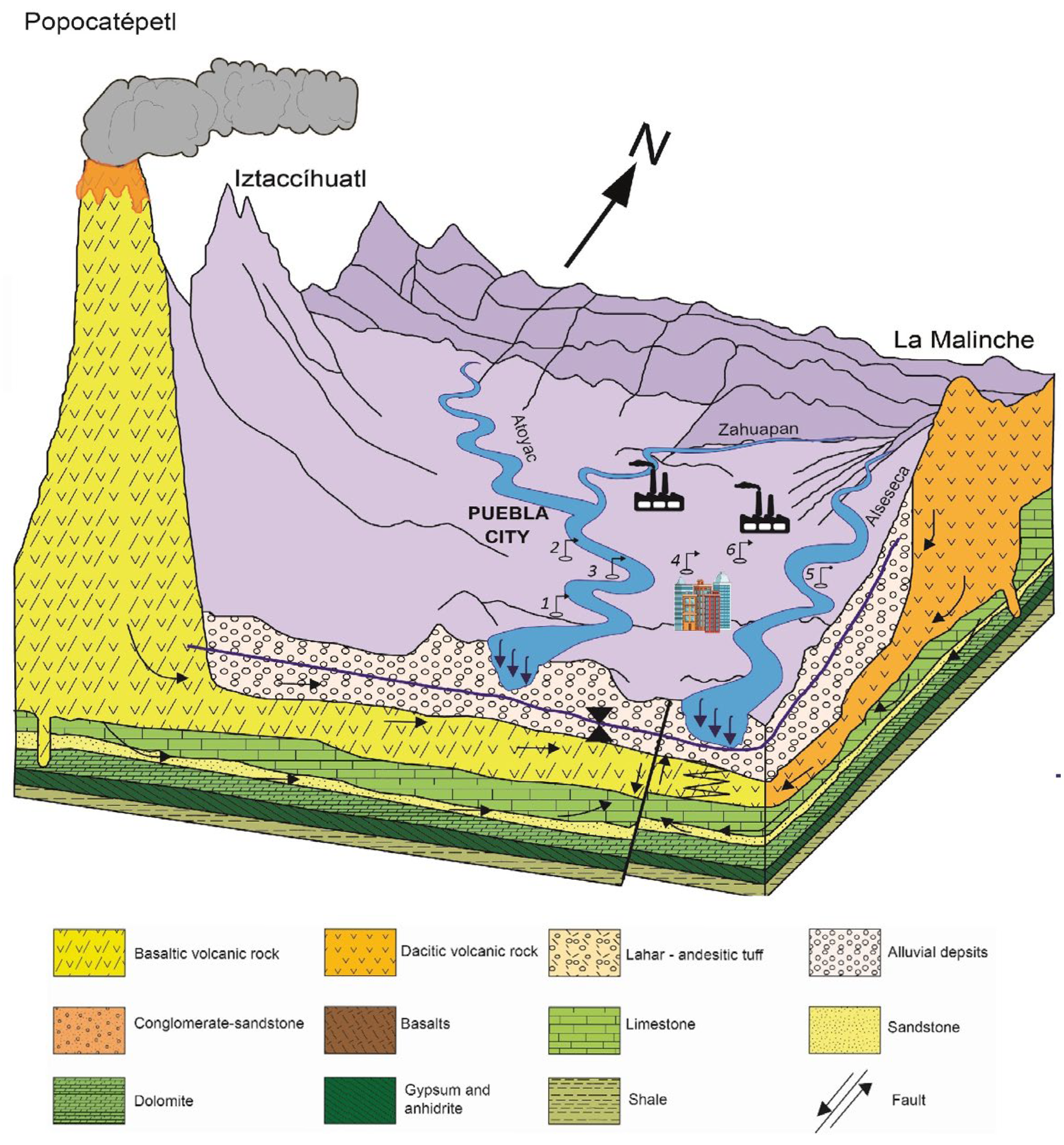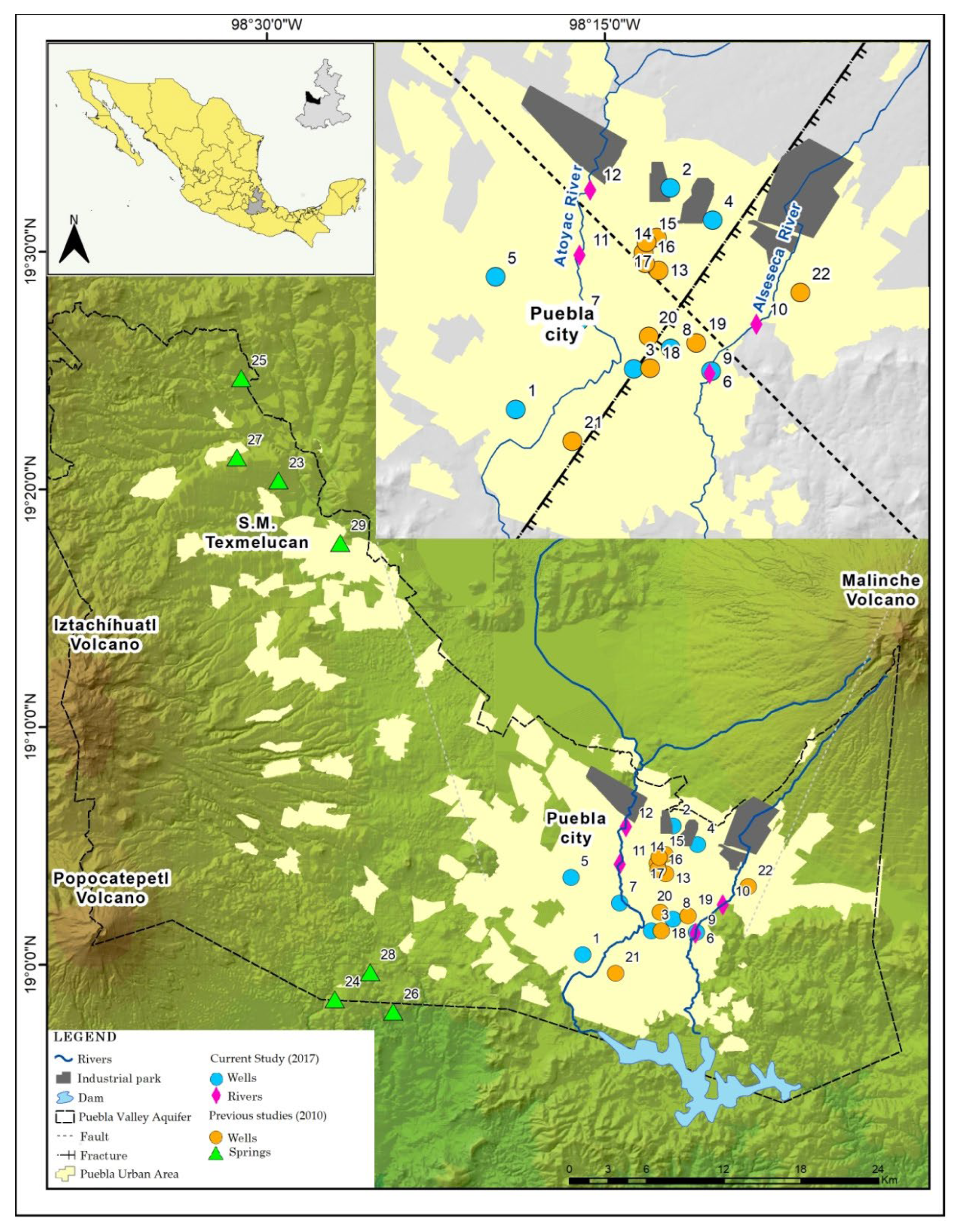 - Salcedo-Sánchez, E.R.; Ocampo-Astudillo, A.; Garrido-Hoyos, S.E.; Martínez-Morales, M. Effects on groundwater quality of the urban area of Puebla aquifer. In Groundwater and Human Development; Thangarajan, M., Singh, V.P., Eds.; Springer International Publishing: Berlin/Heidelberg, Germany, 2019; pp. 201–214. [Google Scholar] [CrossRef]