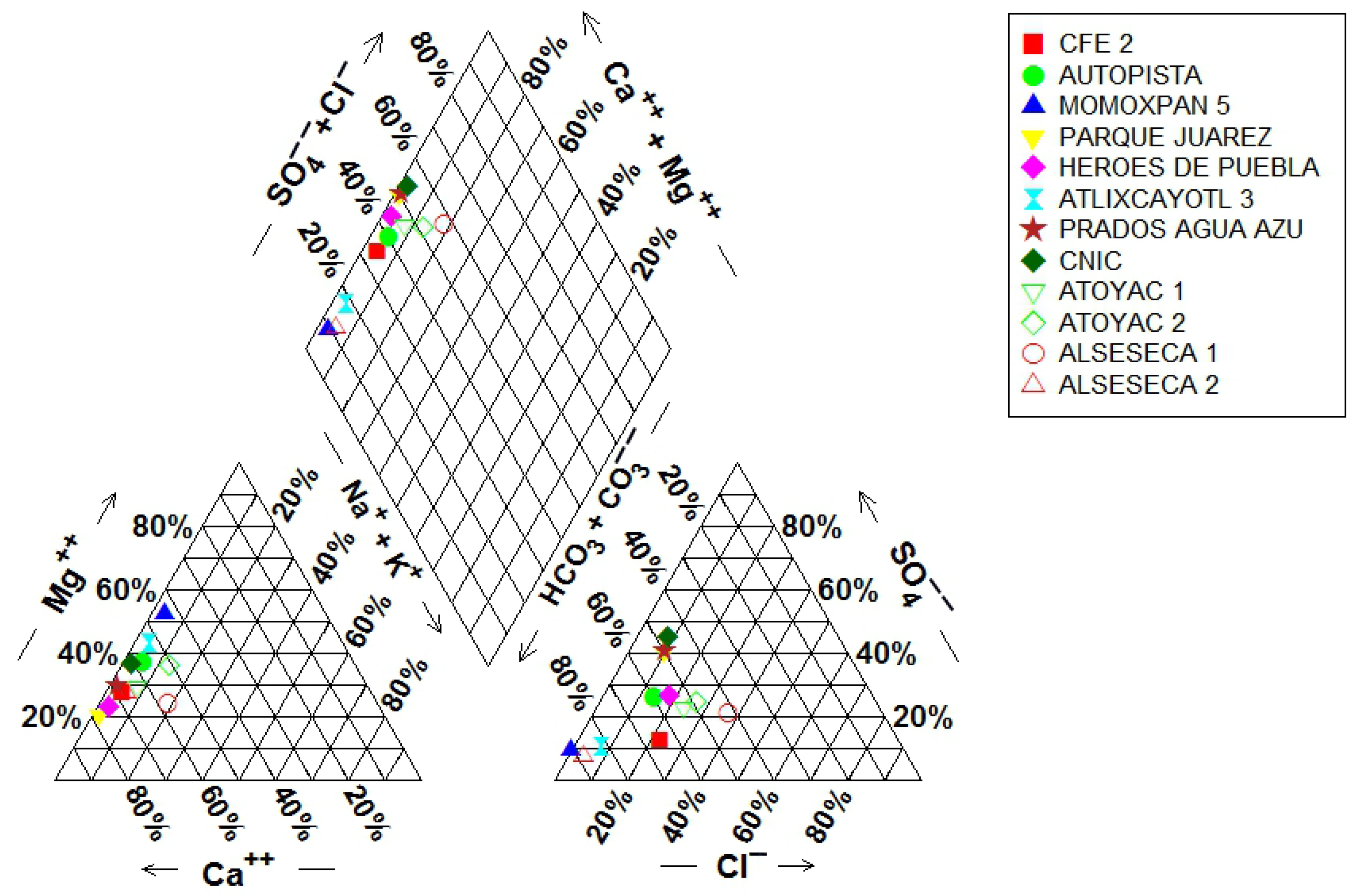 - Garfias, J.; Arroyo, N.; Aravena, R. Hydrochemistry and origins of mineralized waters in the Puebla aquifer system, Mexico. Environ. Earth Sci. 2010, 59, 1789–1805. [Google Scholar] [CrossRef]