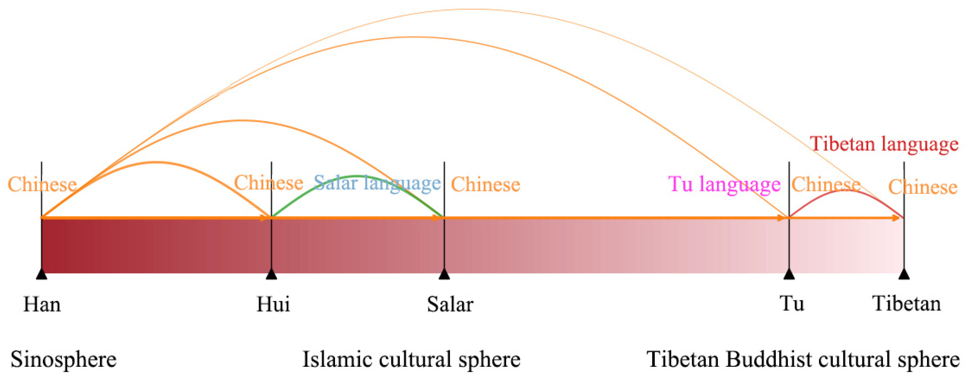 - Zhu, P. Formation and Integration of the Multi-National Culture in Qinghai. J. Tibet. Natl. Inst. 2006, 27, 75–80. [Google Scholar]