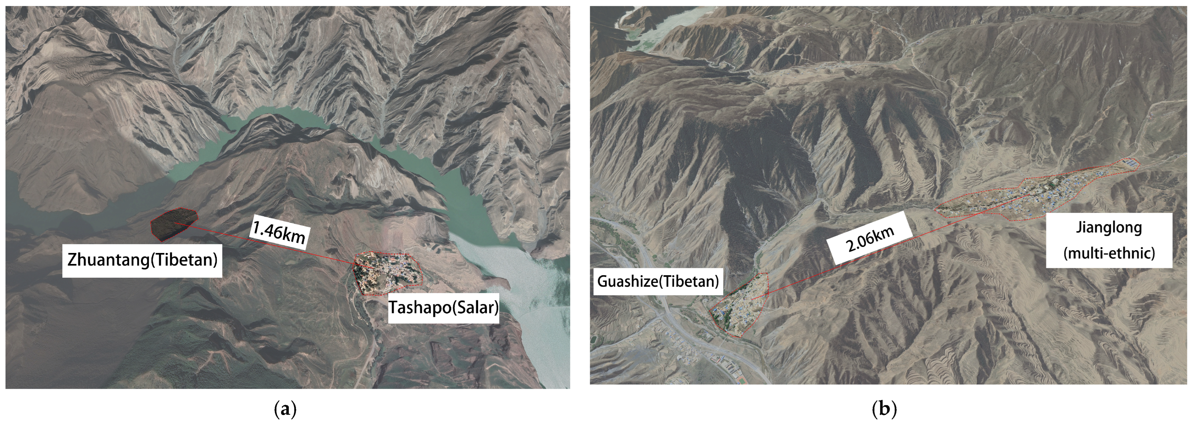 - Jiang, B.; Jiang, T.; Si, J.; Huang, Y.; Du, Y.; Chen, Y. Mechanism of the connection between sacred and secular space: Settlement morphology characteristics in the multi-ethnic areas of the Gansu-Qinghai Plateau. Front. Earth Sci. 2025, 13, 1674493. [Google Scholar] [CrossRef]
