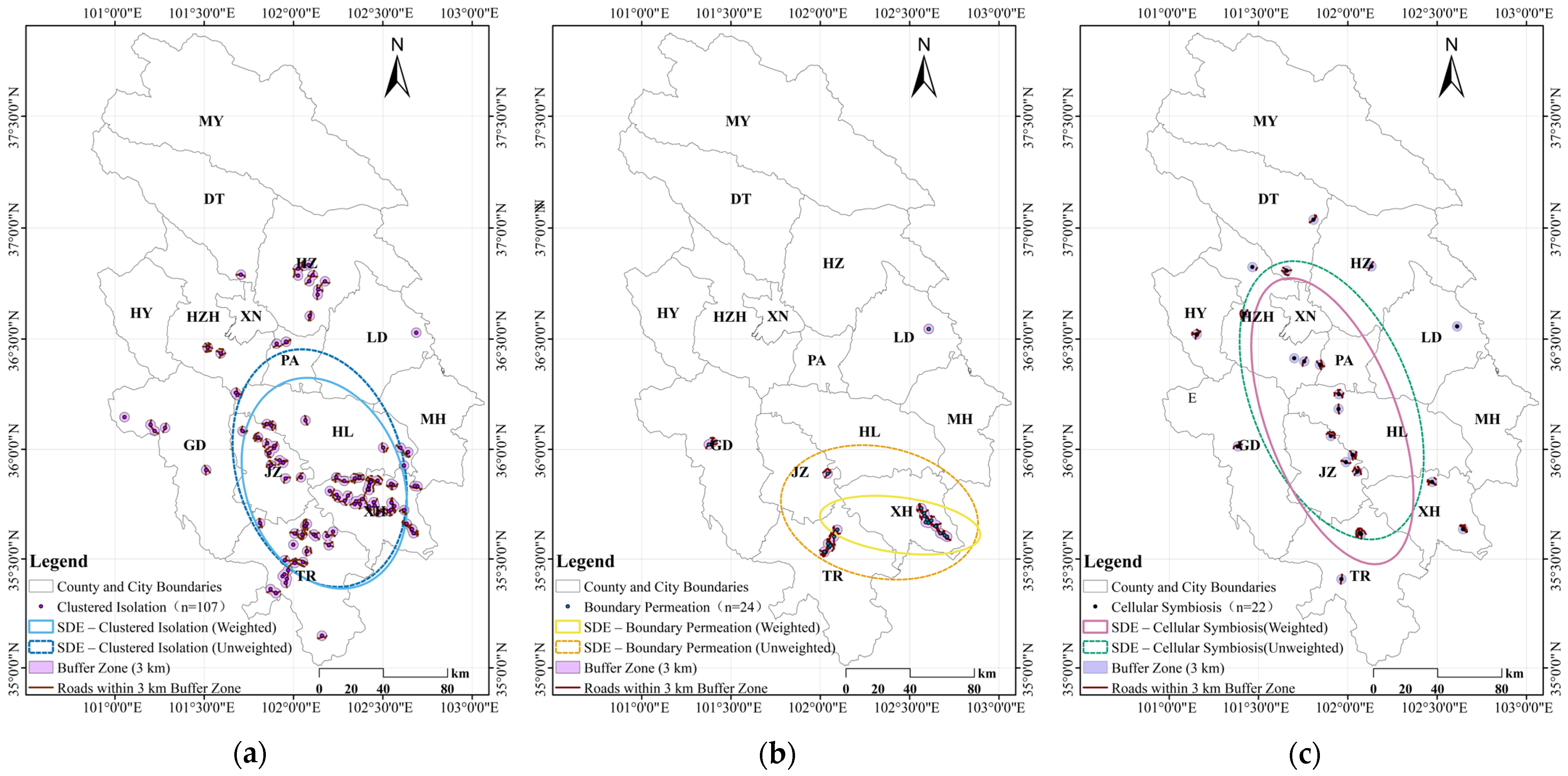 - Chen, Y.; Shu, B.; Amani-Beni, M.; Wei, D. Spatial distribution patterns of rural settlements in the multi-ethnic gathering areas, southwest China: Ethnic inter-embeddedness perspective. J. Asian Archit. Build. Eng. 2023, 23, 372–385. [Google Scholar] [CrossRef]