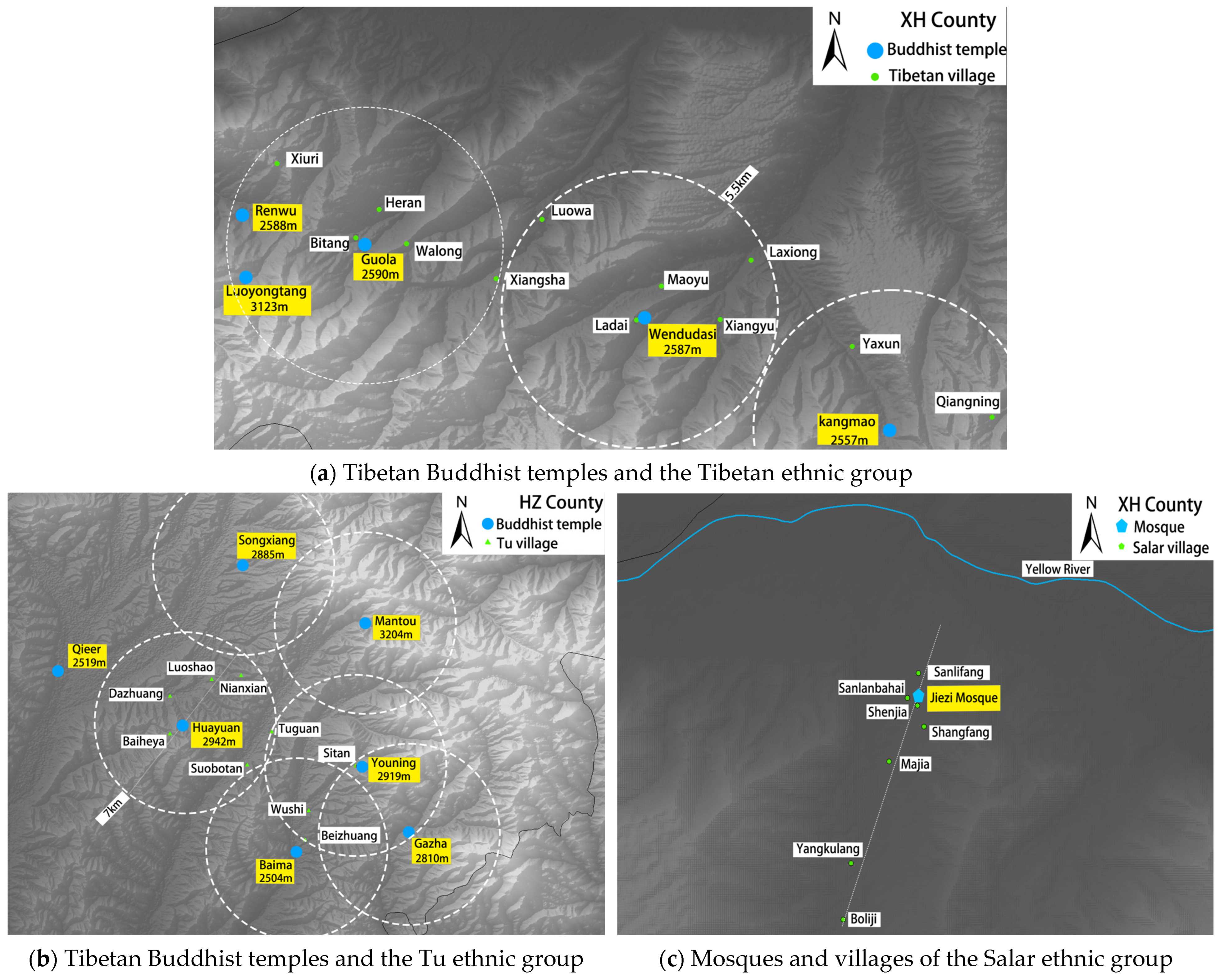 - Zhang, Y.; Li, J.; Wang, J.; Xin, A. Spatial correlation between traditional villages and religious cultural heritage in the Hehuang region, Northwest China. J. Asian Archit. Build. Eng. 2024, 24, 3190–3202. [Google Scholar] [CrossRef]