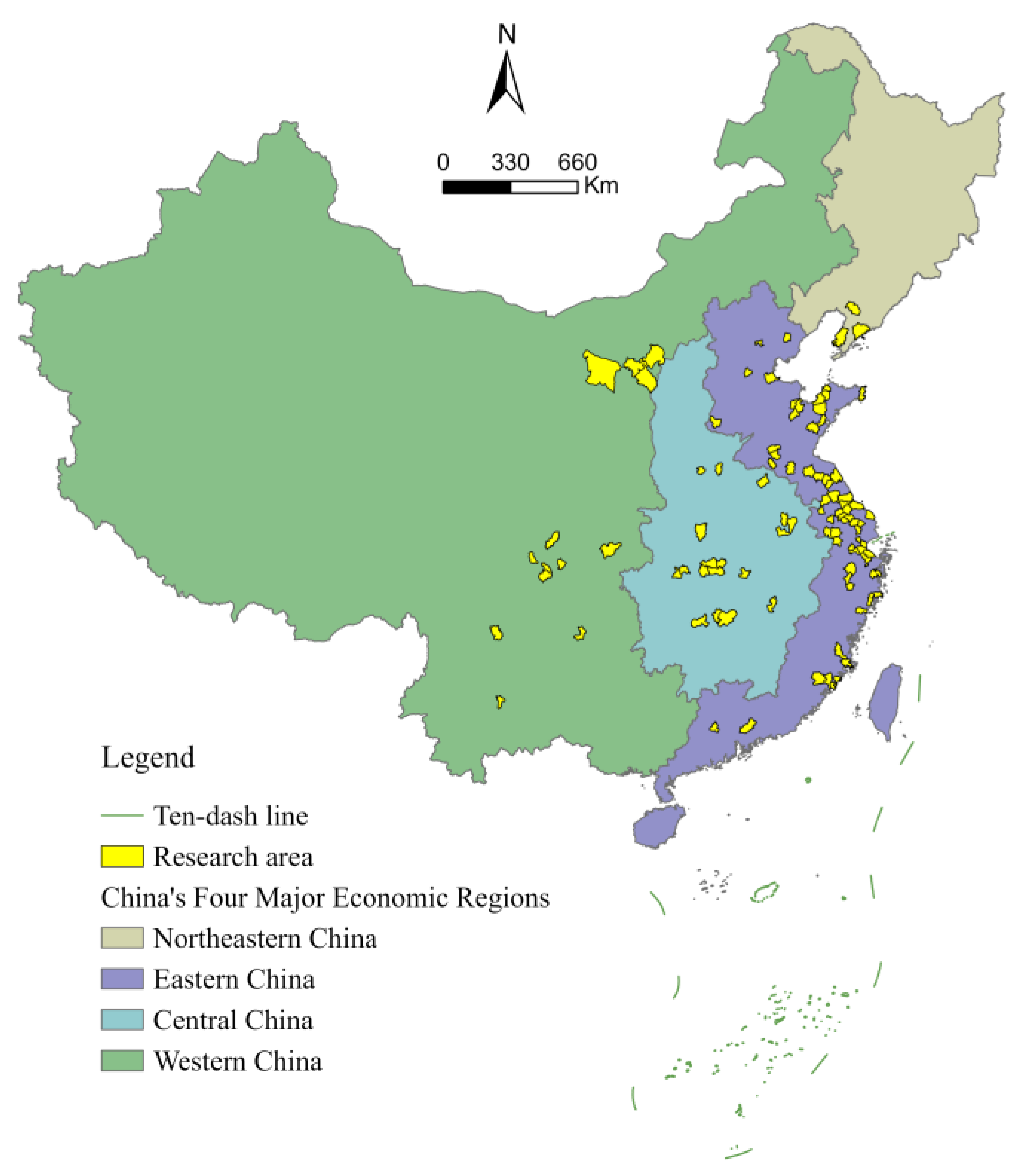 - Miao, H.; Zhou, H. Evaluation of County-Level Economic Efficiency and Its Spatiotemporal Differentiation in Hohhot-Baotou-Ordos-Yulin Urban Agglomeration in China. Humanit. Soc. Sci. Commun. 2023, 10, 99. [Google Scholar] [CrossRef]