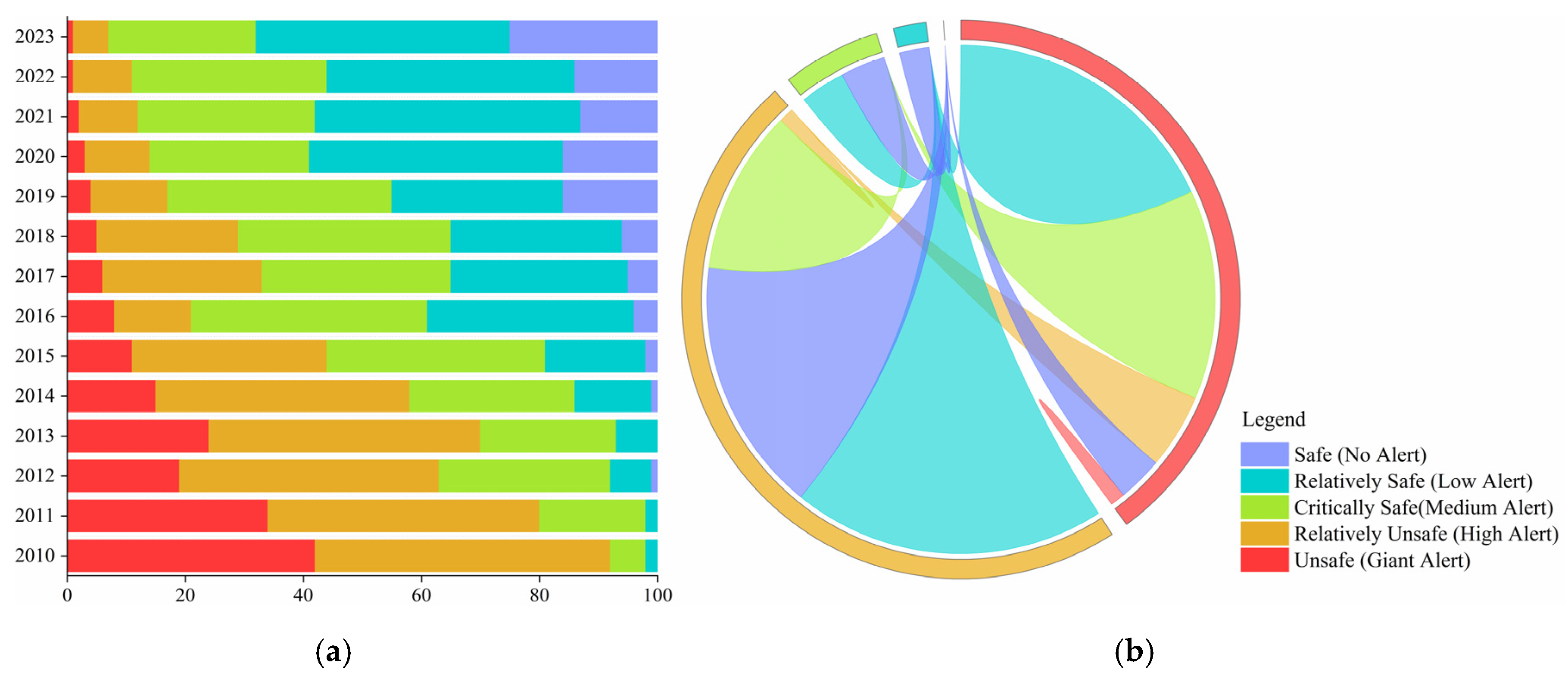 - From 2010 to 2023, the land ecological security warning levels across all counties in the Top 100 Counties improved progressively. The proportion of counties achieving ‘Relatively Safe (Low Alert)’ or higher levels increased from 2% in 2010 to 68% in 2023. The ‘Critically Safe (Medium Alert)’ proportion rose from 6% to 40% before stabilising at around 30%. Conversely, the proportion below ‘Critically Safe (Medium Alert)’ declined rapidly from 92% in 2010 to 7% in 2023. The highest proportion of counties (21%) transitioned from ‘Relatively Unsafe (High Alert)’ to ‘Relatively Safe (Low Alert)’ from 2010 to 2023. Moreover, based on the magnitude of alert level changes, counties classified as ‘significantly improved’ (those advancing by at least three levels) constituted the largest share (32%). Counties classified as ‘relatively lagging’—where the alert level never exceeded ‘Critically Safe (Medium Alert)’—ranked second (22%). Counties categorised as ‘consistently leading’—maintaining an alert level no lower than ‘Critically Safe (Medium Alert)’ while predominantly achieving ‘Safe (No Alert)’ in recent years—represented the smallest proportion (14%). This indicates that most counties have made significant progress in land ecological security, yet some still face considerable ecological pressures requiring enhanced ecological governance and protection measures.