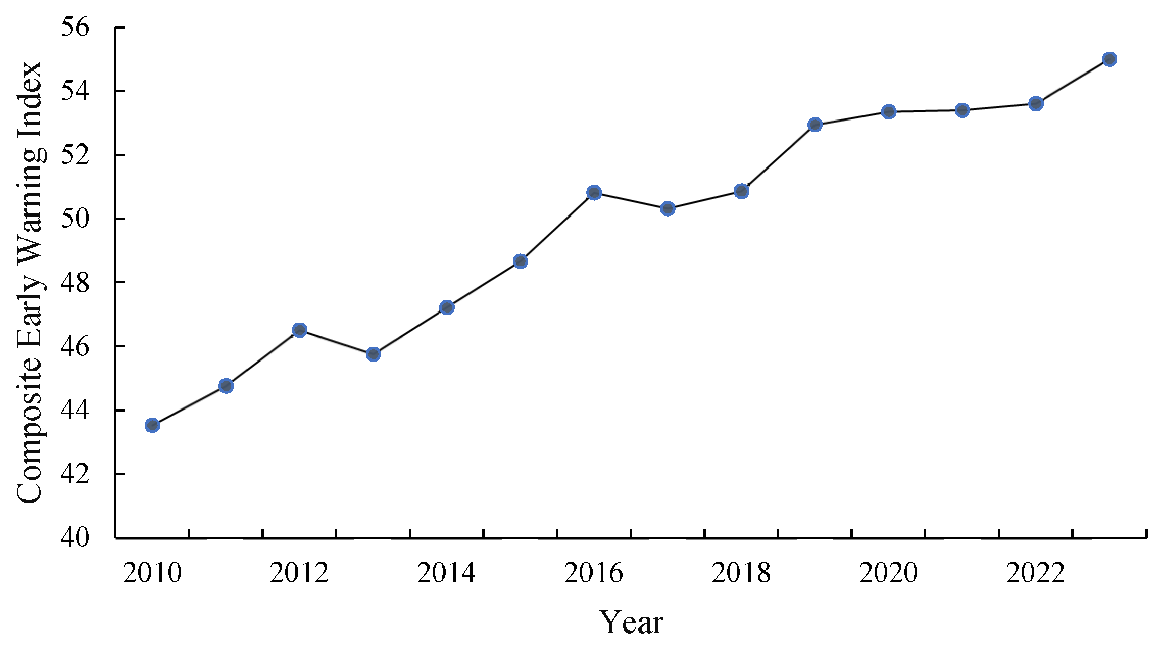 - From 2010 to 2023, the overall comprehensive early warning index for land ecological security among the Top 100 Counties exhibited a ‘stepwise leap’ trend, achieving a transformative progression from the ‘Relatively Unsafe (High Alert)’ to the ‘Relatively Safe (Low Alert)’ level. This evolution unfolded in four phases: ‘fluctuation and adjustment—rapid improvement—plateau consolidation—steady-state optimisation’. This progression indicates that, driven by policies such as ‘ecological civilisation development’, the ‘dual carbon strategy’, and ‘high-quality county-level development’, the Top 100 Counties have significantly enhanced regional ecological security through greening industrial structures, intensifying resource utilisation, and institutionalising ecological governance.
