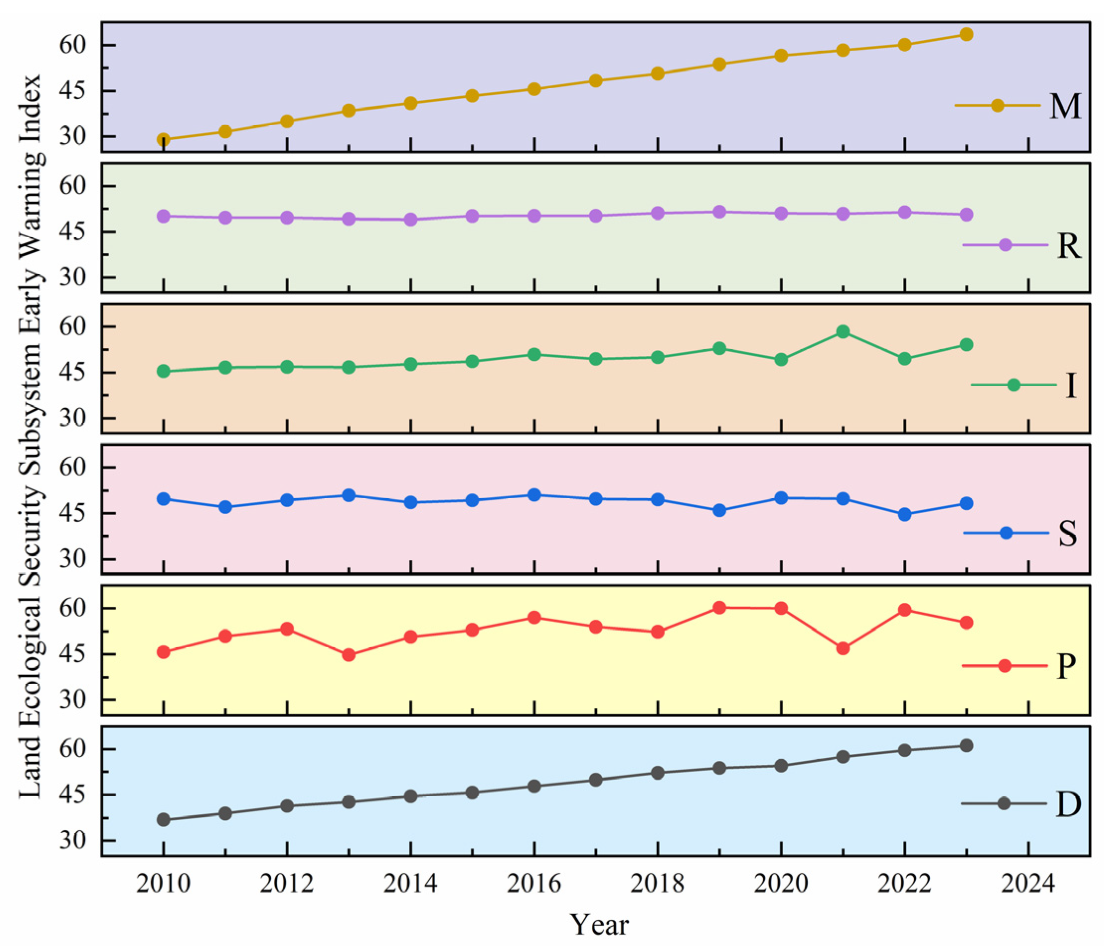 - From 2010 to 2023, the six significant subsystems’ land ecological security in the Top 100 Counties diverged markedly in their evolutionary trajectories. Dual-core drivers of ‘driving-management’ propelled the warning level from ‘Unsafe (Giant Alert)’ to ‘Safe (No Alert)’, becoming the core engine for ecological security enhancement. This advancement primarily stemmed from synchronous growth in economic scale and digital governance investment. Pressure-impact fluctuations showed positive trends, with the alert level approaching ‘Relatively Safe (Low Alert)’ status. However, structural constraints such as high population density, heavy industry dominance, and inefficient ecological–economic conversion continued to exert limitations. The ‘state-response’ warning level fluctuates within the ‘Critically Safe (Medium Alert)’ range, reflecting coexisting ecosystem fragility and governance response lag. Fiscal investment efficiency and institutional refinement require urgent enhancement.