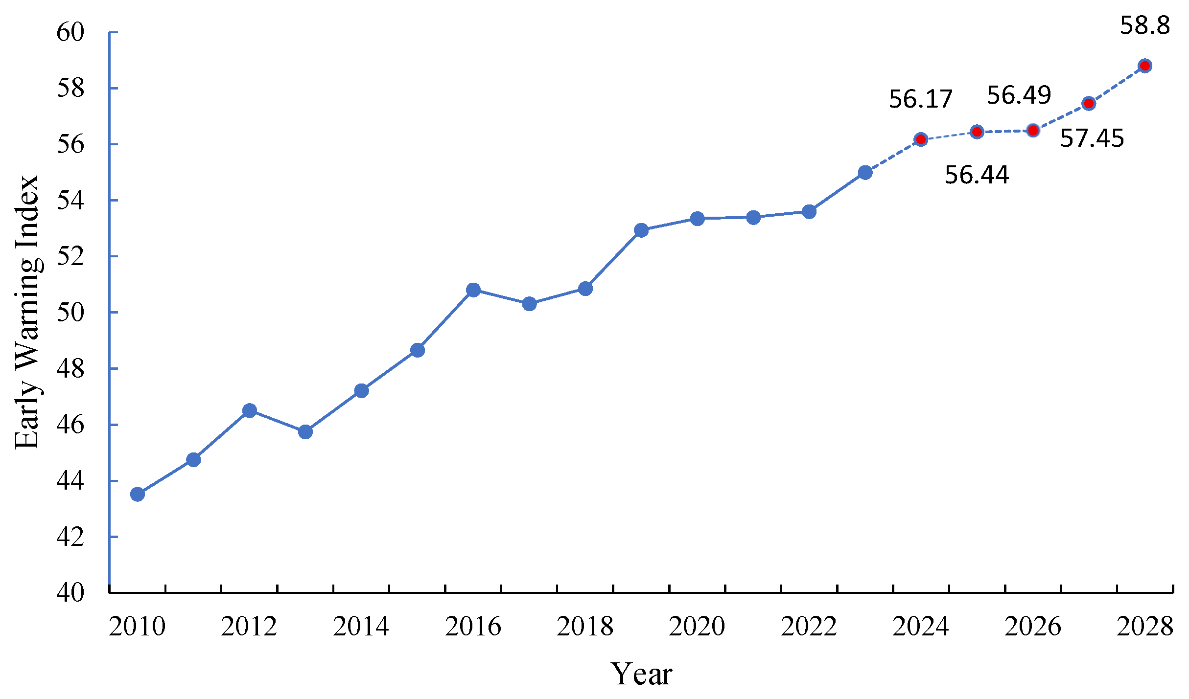 - Over the next five years, the projected comprehensive land ecological safety early warning index for the Top 100 Counties exhibits a ‘gradual stabilisation and upward trend’, rising from 54.99 in 2023 to 58.80 by 2028, marking a historic transition from ‘Relatively Safe (Low Alert)’ to ‘Safe (No Alert)’ status by 2028. The projected values of the subsystem early warning indices exhibit a polarised pattern of ‘three increases, two stagnations, and one decline’. The sustained optimisation of the driving, management, and pressure subsystems stems from green investment, digital governance, and capacity optimisation. The response and impact subsystems remain stagnant and volatile, exposing fiscal inefficiency and slow conversion of ecological dividends. The state subsystem shows a declining trend due to the lag in ecological baseline recovery. The key to achieving land ecological security development in the Top 100 Counties lies in channelling the spillover benefits from the three improving subsystems to the two stagnant ones while reversing the inertia of the state subsystem through ecological restoration.