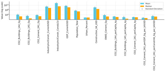 The results presented in the following section provide extensive information about carbon emissions, economic activity levels, construction sector performance, population patterns, and urbanization throughout its worldwide dataset of 7038 observations. The research findings demonstrate substantial differences in CO2 emissions stemming from building and cement production activities. The foundation of the research starts with Table 1 and Figure 1, which present descriptive statistics for all essential variables. The average emissions from residential buildings, CO2_Buildings_1A4_Gg, were 14,807.1 Gg, with a standard deviation of 59,520.7 Gg, indicating substantial differences between countries. Commercial building emissions, CO2_Buildings_1A5_Gg, exhibited a lower average of 1161.1 Gg, yet displayed substantial variability, as indicated by an SD of 6241.2 Gg. Cement production emissions, CO2_Cement_2A1_Gg, reached 6322.3 Gg on average, with a maximum value reaching 820,965 Gg and a standard deviation of 41,279.0 Gg, which demonstrates cement’s essential role in global CO2 emissions. The results confirm the findings of previous studies showing that the cement and building sectors produce the highest carbon emissions across the construction industry [5,6,12,13]. In the current study, the author builds on previous research by using a single global dataset to analyze both production and economic indicators, which measure sectoral emissions. The extensive dataset provides detailed patterns of emission intensity that the authors of earlier country-specific studies failed to detect [43,44,45].
